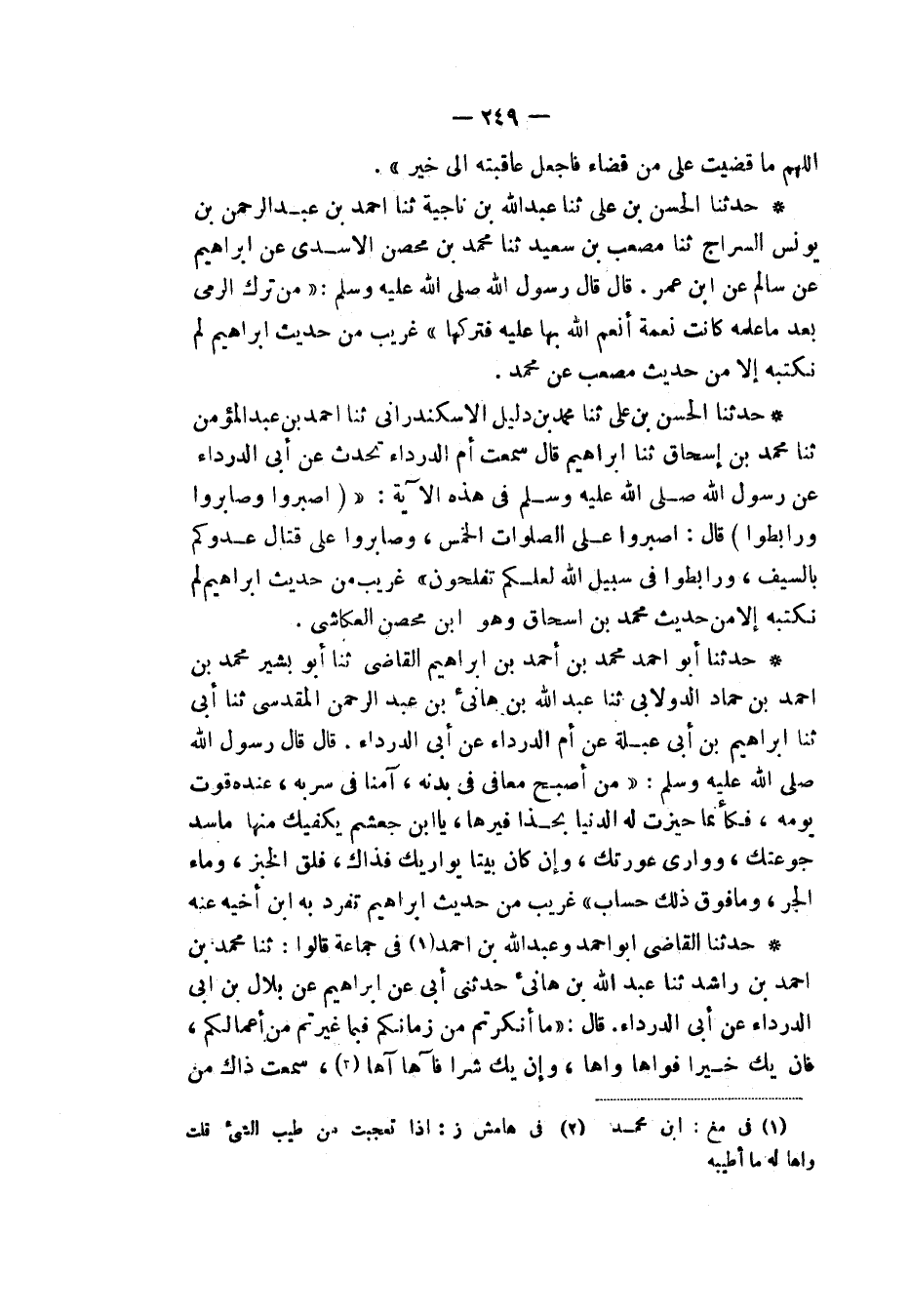 حَدَّثَنَا الْقَاضِي أَبُو أَحْمَدَ، وَعَبْدُ اللهِ بْنُ أَحْمَدَ، فِي جَمَاعَةٍ قَالُوا: ثنا مُحَمَّدُ بْنُ أَحْمَدَ بْنِ رَاشِدٍ، ثنا عَبْدُ اللهِ بْنُ هَانِئٍ، حَدَّثَنِي أَبِي، عَنْ إِبْرَاهِيمَ، عَنْ بِلَالِ بْنِ أَبِي الدَّرْدَاءِ، عَنْ أَبِي الدَّرْدَاءِ قَالَ: «§مَا أَنْكَرْتُمْ مِنْ زَمَانِكُمْ فِيمَا غَيَّرْتُمْ مِنْ أَعْمَالِكُمْ، فَإِنْ يَكُ خَيْرًا فَوَاهًا وَاهًا، وَإِنْ يَكُ شَرًّا فَآهًا آهًا» سَمِعْتُ ذَاكَ مِنْ -[250]- نَبِيِّكُمْ صَلَّى اللهُ عَلَيْهِ وَسَلَّمَ