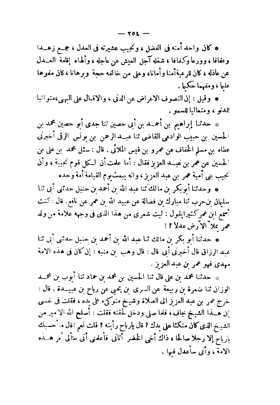 حَدَّثَنَا إِبْرَاهِيمُ بْنُ أَحْمَدَ بْنِ أَبِي حُصَيْنٍ، ثنا جَدِّي أَبُو حُصَيْنٍ مُحَمَّدُ بْنُ الْحُسَيْنِ بْنِ حَبِيبٍ الْوَادِعِيُّ الْقَاضِي، ثنا عَبْدُ الرَّحْمَنِ بْنُ يُونُسَ الرَّقِّيُّ، أَخْبَرَنِي عَطَاءُ بْنُ مُسْلِمٍ الْخَفَّافُ، عَنْ عَمْرِو بْنِ قَيْسٍ الْمُلَائِيِّ قَالَ: سُئِلَ مُحَمَّدُ بْنُ عَلِيِّ بْنِ الْحُسَيْنِ، عَنْ عُمَرَ بْنِ عَبْدِ الْعَزِيزِ، فَقَالَ: «§أَمَا عَلِمْتَ أَنَّ لِكُلِّ قَوْمٍ نَجِيبَةً، وَأَنَّ نَجِيبَ بَنِي أُمَيَّةَ عُمَرُ بْنُ عَبْدِ الْعَزِيزِ، وَأَنَّهُ يُبْعَثُ يَوْمَ الْقِيَامَةِ أُمَّةً وَحْدَهُ»