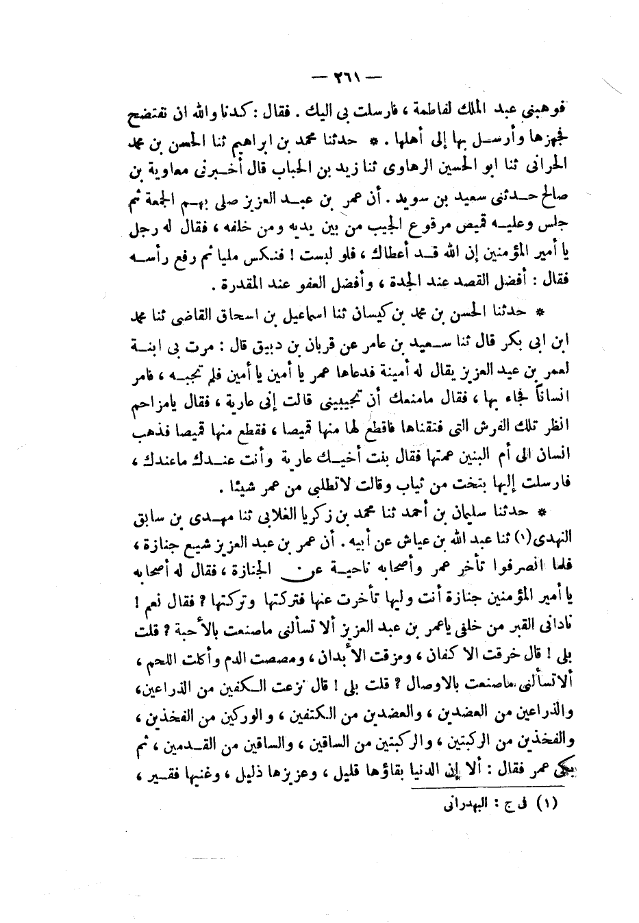 حَدَّثَنَا مُحَمَّدُ بْنُ إِبْرَاهِيمَ، ثنا الْحَسَنُ بْنُ مُحَمَّدِ الْحَرَّانِيُّ، ثنا أَبُو الْحُسَيْنِ الرَّهَاوِيُّ، ثنا زَيْدُ بْنُ الْحُبَابِ قَالَ: أَخْبَرَنِي مُعَاوِيَةُ بْنُ صَالِحٍ، حَدَّثَنِي سَعِيدُ بْنُ سُوَيْدٍ، أَنَّ عُمَرَ بْنَ عَبْدِ الْعَزِيزِ صَلَّى بِهِمُ الْجُمُعَةَ، ثُمَّ جَلَسَ وَعَلَيْهِ قَمِيصٌ مَرْقُوعُ الْجَيْبِ مِنْ بَيْنِ يَدَيْهِ وَمِنْ خَلْفِهِ، فَقَالَ لَهُ رَجُلٌ: يَا أَمِيرَ الْمُؤْمِنِينَ، إِنَّ اللهَ قَدْ أَعْطَاكَ، فَلَوْ لَبِسْتَ؟ فَنَكَّسَ مَلِيًّا، ثُمَّ رَفَعَ رَأْسَهُ فَقَالَ: §أَفْضَلُ الْقَصْدِ عِنْدَ الْجَدَّةِ، وَأَفْضَلُ الْعَفْوِ عِنْدَ الْمَقْدِرَةِ "