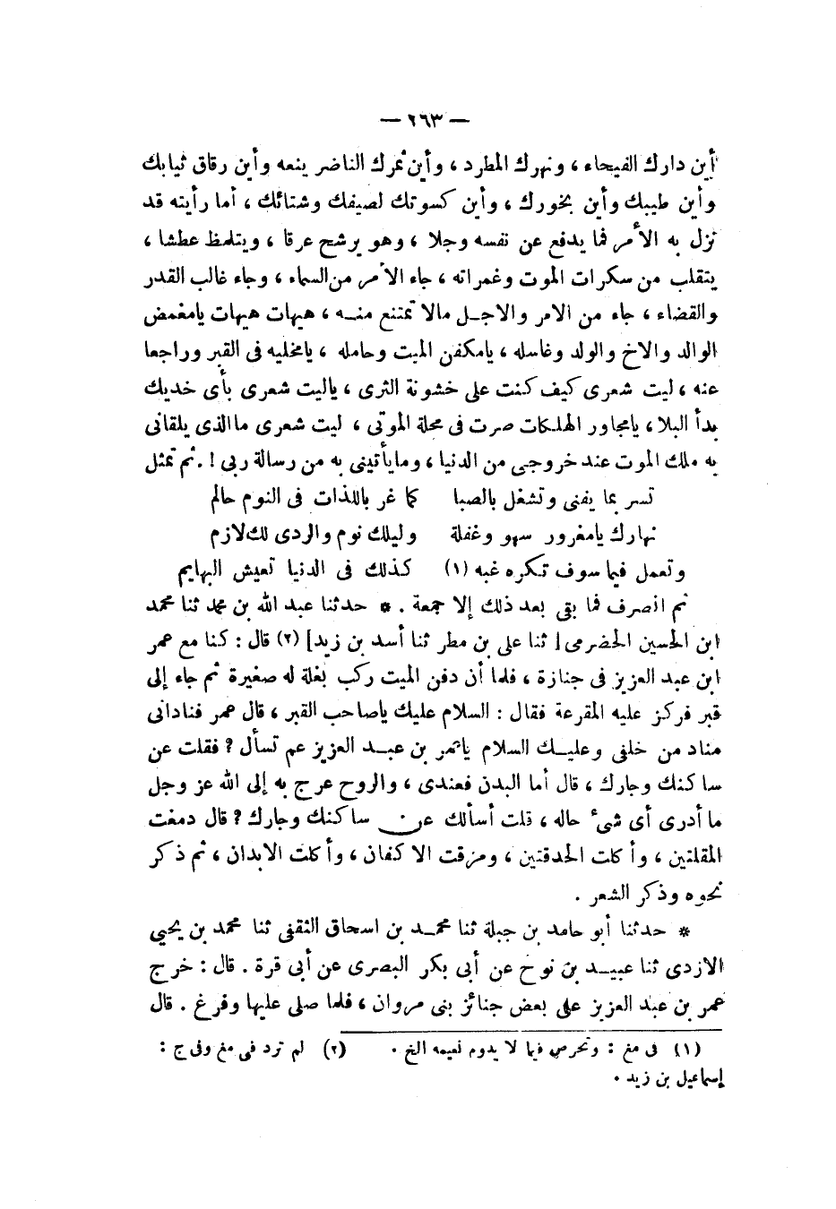 حَدَّثَنَا عَبْدُ اللهِ بْنُ مُحَمَّدٍ، ثنا مُحَمَّدُ بْنُ الْحُسَيْنِ الْحَضْرَمِيُّ، ثنا عَلِيُّ بْنُ مَطَرٍ، ثنا أَسَدُ بْنُ زَيْدٍ قَالَ: كُنَّا مَعَ عُمَرَ بْنِ عَبْدِ الْعَزِيزِ فِي جَنَازَةٍ، فَلَمَّا أَنْ دُفِنَ الْمَيِّتُ رَكِبَ بَغْلَةً لَهُ صَغِيرَةً، ثُمَّ جَاءَ إِلَى قَبْرٍ، فَرَكَزَ عَلَيْهِ الْمِقْرَعَةَ فَقَالَ: السَّلَامُ عَلَيْكَ يَا صَاحِبَ الْقَبْرِ قَالَ عُمَرُ: فَنَادَانِي مُنَادٍ مِنْ خَلْفِي: وَعَلَيْكَ السَّلَامُ يَا عُمَرُ بْنَ عَبْدِ الْعَزِيزِ، عَمَّ تَسْأَلُ؟ فَقُلْتُ: عَنْ سَاكِنِكَ وَجَارَكَ، قَالَ: أَمَا الْبَدَنُ فَعِنْدِي، وَالرُّوحُ عُرِجَ بِهِ إِلَى اللهِ عَزَّ وَجَلَّ، مَا أَدْرِي أَيُّ شَيْءٍ حَالُهُ، قُلْتُ: §أَسْأَلُكَ عَنْ سَاكِنِكَ وَجَارِكَ، قَالَ: دَمَغْتُ الْمُقْلَتَيْنِ، وَأَكَلْتُ الْحَدَقَتَيْنِ، وَمَزَّقْتُ الْأَكْفَانَ، وَأَكَلْتُ الْأَبْدَانَ «ثُمَّ ذَكَرَ نَحْوَهُ وَذَكَرَ الشِّعْرَ»