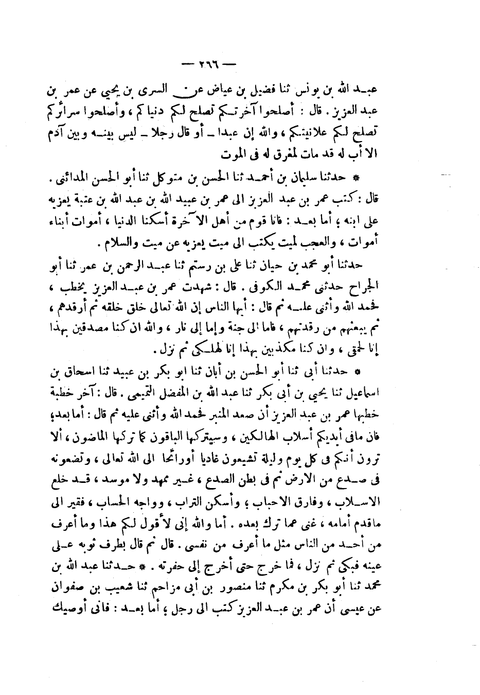 حَدَّثَنَا أَبِي، ثنا أَبُو الْحَسَنِ بْنُ أَبَانَ، ثنا أَبُو بَكْرِ بْنُ عُبَيْدٍ، ثنا إِسْحَاقُ بْنُ إِسْمَاعِيلَ، ثنا يَحْيَى بْنُ أَبِي بَكْرٍ، ثنا عَبْدُ اللهِ بْنُ الْمُفَضَّلِ التَّمِيمِيُّ قَالَ: آخِرُ خِطْبَةٍ خَطَبَهَا عُمَرُ بْنُ عَبْدِ الْعَزِيزِ أَنْ صَعِدَ الْمِنْبَرَ، فَحَمِدَ اللهَ وَأَثْنَى عَلَيْهِ ثُمَّ قَالَ: أَمَّا بَعْدُ، " §فَإِنَّ مَا فِي أَيْدِيكُمْ أَسْلَابُ الْهَالِكِينَ، وَسَيَتْرُكُهَا الْبَاقُونَ كَمَا تَرَكَهَا الْمَاضُونَ، أَلَا تَرَوْنَ أَنَّكُمْ فِي كُلِّ يَوْمٍ وَلَيْلَةٍ تُشَيِّعُونَ غَادِيًا أَوْ رَائِحًا إِلَى اللهِ تَعَالَى وَتَضَعُونَهُ فِي صَدْعٍ مِنَ الْأَرْضِ ثُمَّ فِي بَطْنِ الصَّدْعِ، غَيْرَ مُمَهَّدٍ وَلَا مُوَسَّدٍ، قَدْ خَلَعَ الْأَسْلَابَ، وَفَارَقَ الْأَحْبَابَ، وَأُسْكِنَ التُّرَابَ، وَوَاجَهَ الْحِسَابَ، فَقِيرٌ إِلَى مَا قَدَّمَ أَمَامَهُ، غَنِيٌّ عَمَّا تَرَكَ بَعْدَهُ؟، أَمَا وَاللهِ إِنِّي لَأَقُولُ لَكُمْ هَذَا، وَمَا أَعْرِفُ مِنْ أَحَدٍ مِنَ النَّاسِ مِثْلَ مَا أَعْرِفُ مِنْ نَفْسِي، قَالَ: ثُمَّ قَالَ: بِطَرْفِ ثَوْبِهِ عَلَى عَيْنِهِ فَبَكَى، ثُمَّ نَزَلَ فَمَا خَرَجَ حَتَّى أُخْرِجَ إِلَى حُفْرَتِهِ "