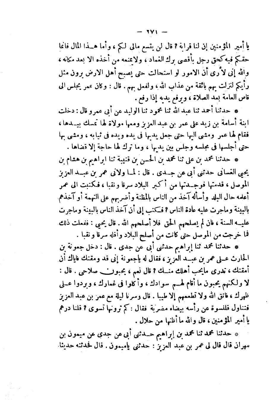 حَدَّثَنَا محمد، ثَنَا مُحَمَّدُ بْنُ إِبْرَاهِيمَ، حَدَّثَنِي أَبِي، عَنْ جَدِّي، عَنْ مَيْمُونِ بْنِ مِهْرَانَ قَالَ: قَالَ لِي عُمَرُ بْنُ عَبْدِ الْعَزِيزِ: حَدِّثْنِي يَا مَيْمُونُ قَالَ: فَحَدَّثْتُهُ حَدِيثًا -[272]-، بَكَى مِنْهُ بُكَاءً شَدِيدًا، فَقُلْتُ: يَا أَمِيرَ الْمُؤْمِنِينَ، لَوْ عَلِمْتُ أَنَّكَ تَبْكِي هَذَا الْبُكَاءَ لَحَدَّثْتُكَ حَدِيثًا أَلْينَ مِنْ هَذَا، فَقَالَ: يَا مَيْمُونُ، " إِنَّا نَأْكُلُ هَذِهِ الشَّجَرَةَ الْعَدَسَ، وَهِيَ مَا عَلِمْتُ مُرِقَّةٌ لِلْقَلْبِ، مُغَزِّرَةٌ لِلدَّمْعَةِ، مُذِلَّةٌ لِلْجَسَدِ، قَالَ مَيْمُونٌ: وَدَعَانِي عُمَرُ فَقَالَ: يَا مِهْرَانُ بْنَ مَيْمُونٍ قُلْتُ أَوْ مَيْمُونُ بْنُ مِهْرَانَ يَا أَمِيرَ الْمُؤْمِنِينَ، قَالَ أَوْ مَيْمُونُ بْنُ مِهْرَانَ إِنِّي أُوصِيكَ بِوَصِيَّةٍ فَاحْفَظْهَا «§إِيَّاكَ أَنْ تَخْلُوَ بِامْرَأَةٍ غَيْرِ ذَاتِ مَحْرَمٍ، وَإِنْ حَدَّثَتْكَ نَفْسُكَ أَنْ تَعَلِّمَهَا الْقُرْآنَ»