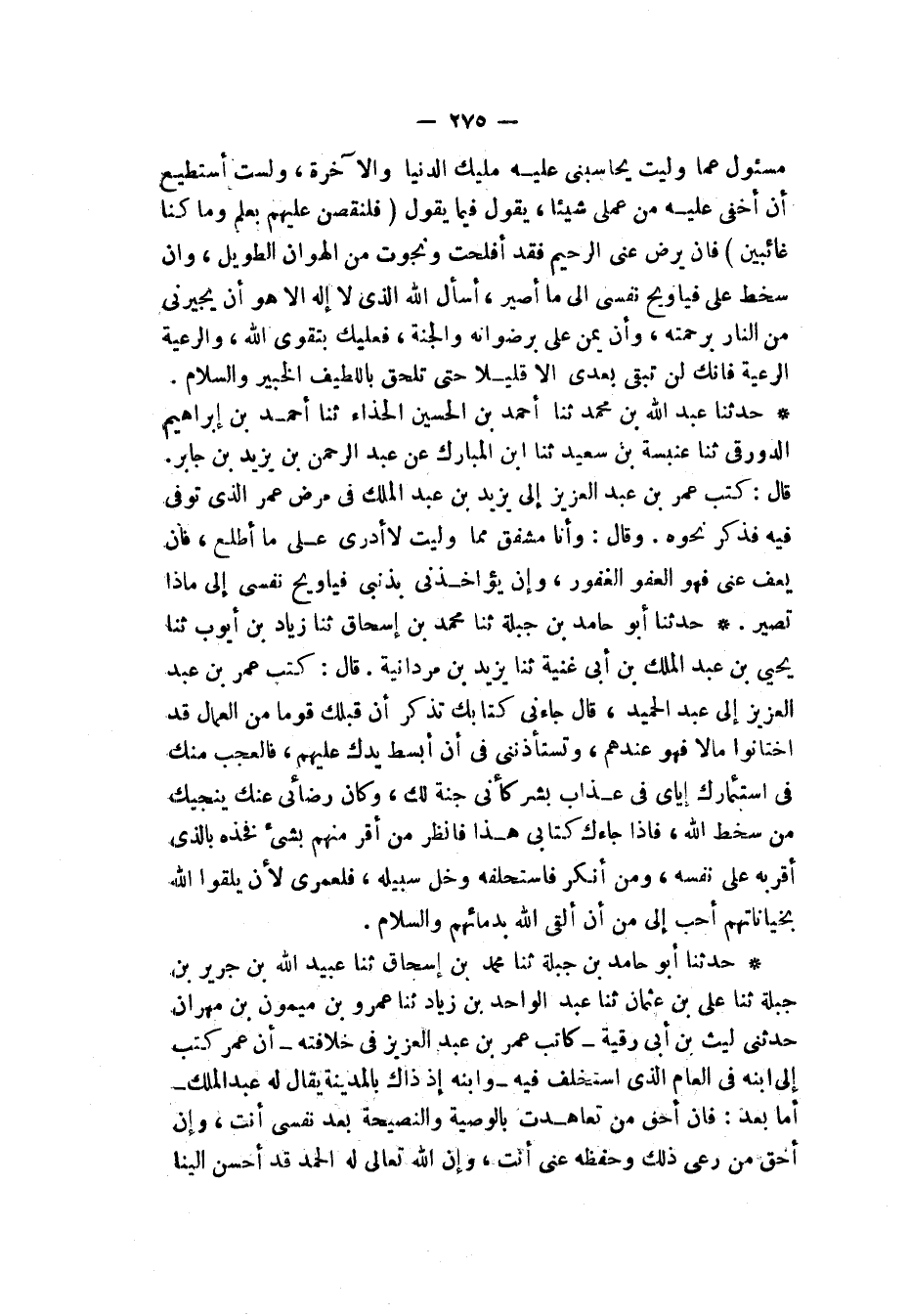 حَدَّثَنَا أَبُو حَامِدِ بْنُ جَبَلَةَ، ثَنَا مُحَمَّدُ بْنُ إِسْحَاقَ، ثَنَا عُبَيْدُ اللهِ بْنُ جَرِيرِ بْنِ جَبَلَةَ، ثنا عَلِيُّ بْنُ عُثْمَانَ، ثَنَا عَبْدُ الْوَاحِدِ بْنُ زِيَادٍ، ثَنَا عَمْرُو بْنُ مَيْمُونِ بْنِ مِهْرَانَ، حَدَّثَنِي لَيْثُ بْنُ أَبِي رُقِيَّةَ كَاتِبُ عُمَرَ بْنِ عَبْدِ الْعَزِيزِ فِي خِلَافَتِهِ، أَنَّ عُمَرَ كَتَبَ إِلَى ابْنِهِ فِي الْعَامِ الَّذِي اسْتُخْلِفَ فِيهِ - وَابْنُهُ إِذْ ذَاكَ بِالْمَدِينَةِ يُقَالُ لَهُ عَبْدُ الْمَلِكِ - أَمَّا بَعْدُ: فَإِنَّ أَحَقَّ مَنْ تَعَاهَدْتُ بِالْوَصِيَّةِ وَالنَّصِيحَةِ بَعْدَ نَفْسِي أَنْتَ، وَإِنَّ أَحَقَّ مَنْ رَعَى ذَلِكَ وَحَفِظَهُ عَنِّي أَنْتَ، §وَإِنَّ اللهَ تَعَالَى لَهُ الْحَمْدُ قَدِ أَحْسَنَ إِلَيْنَا -[276]- إِحْسَانًا كَثِيرًا بَالِغًا فِي لَطِيفِ أَمْرِنَا وَعَامَّتِهِ، وَعَلَى اللهِ إِتْمَامُ مَا عَبَرَ مِنَ النِّعْمَةِ، وَإِيَّاهُ نَسْأَلُ الْعَوْنَ عَلَى شُكْرِهَا، فَاذْكُرْ فَضْلَ اللهِ عَلَى أَبِيكَ وَعَلَيْكَ، ثُمَّ أَعِنْ أَبَاكَ عَلَى مَا قَوِيَ عَلَيْهِ، وَعَلَى مَا ظَنَنْتَ أَنَّ عِنْدَهُ مِنْهُ عَجْزًا عَنِ الْعَمَلِ فِيمَا أَنْعَمَ بِهِ عَلَيْهِ وَعَلَيْكَ فِي ذَلِكَ، فَرَاعِ نَفْسَكَ وَشَبَابَكَ وَصِحَّتَكَ، وَإِنِ اسْتَطَعْتَ أَنْ تُكْثِرَ تَحْرِيكَ لِسَانَكَ بِذِكْرِ اللهِ حَمْدًا وَتَسْبِيحًا وَتَهْلِيلًا فَافْعَلْ، فَإِنَّ أَحْسَنَ مَا وَصَلْتَ بِهِ حَدِيثًا حَسَنًا حَمْدُ اللهِ وَذِكْرُهُ، وَإِنَّ أَحْسَنَ مَا قَطَعْتَ بِهِ حَدِيثًا سَيِّئًا حَمْدُ اللهِ وَذِكْرُهُ، وَلَا تُفْتَنَنَّ فِيمَا أَنْعَمَ اللهُ بِهِ عَلَيْكَ فِيمَا عَسَيْتَ أَنْ تُقَرِّظَ بِهِ أَبَاكَ فِيمَا لَيْسَ فِيهِ، إِنَّ أَبَاكَ كَانَ بَيْنَ ظَهْرَانَيْ إِخْوَتِهِ عِنْدَ أَبِيهِ، يُفَضِّلُ عَلَيْهِ الْكَبِيرَ، وَيُدْنِي دُونَهُ الصَّغِيرَ، وَإِنْ كَانَ اللهُ وَلَهُ الْحَمْدُ قَدْ رَزَقَنِي مِنْ وَالِدِي حَسَبًا جَمِيلًا كُنْتُ بِهِ رَاضِيًا، أَرَى أَفْضَلَ الَّذِي يُبِرُّهُ وَلَدُهُ عَلَيَّ حَقًّا، حَتَّى وُلِدْتَ وَوُلِدَ طَائِفَةٌ مِنْ أَخَواتِكَ، وَلَا أَخْرُجُ بِكُمْ مِنَ الْمَنْزِلِ الَّذِي أَنَا فِيهِ، فَمَنْ كَانَ رَاغِبًا فِي الْجَنَّةِ وَهَارِبًا مِنَ النَّارِ فَالْآنَ فِي هَذِهِ الْحَالَةِ، وَالتَّوْبَةُ مَقْبُولَةٌ، وَالذَّنْبُ مَغْفُورٌ قَبْلَ نَفَادِ الْأَجَلِ، وَانْقِضَاءِ الْعَمَلِ، وَفَرَاغٍ مِنَ اللهِ لِلثَّقَلَيْنِ لِيُدِينَهُمْ بِأَعْمَالِهِمْ فِي مَوْطِنٍ لَا تُقْبَلُ فِيهِ الْفِدْيَةُ، وَلَا تَنْفَعُ فِيهِ الْمَعْذِرَةُ، تُبْرَزُ فِيهِ الْخَفِيَّاتِ، وَتُبْطَلُ فِيهِ الشَّفَاعَاتِ، يَرِدُهُ النَّاسُ بِأَعْمَالِهِمْ، وَيصْدُرُونَ فِيهِ أَشْتَاتًا إِلَى مَنَازِلِهِمْ، فَطُوبَى يَوْمَئِذٍ لِمَنْ أَطَاعَ اللهَ، وَوَيْلٌ يَوْمَئِذٍ لِمَنْ عَصَى اللهَ، فَإِنِ ابْتَلَاكَ اللهُ بِغِنًى فَاقْتَصِدْ فِي غِنَاكَ، وَضَعْ لِلَّهِ نَفْسَكَ، وَأَدِّ إِلَى اللهِ فَرَائِضَ حَقِّهِ فِي مَالِكَ، وَقُلْ عِنْدَ ذَلِكَ مَا قَالَ الْعَبْدُ الصَّالِحُ: {هَذَا مِنْ فَضْلِ رَبِّي لِيَبْلُوَنِي أَأَشْكُرُ أَمْ أَكْفُرُ} [النمل: 40] الْآيَةُ. وَإِيَّاكَ أَنْ تَفْخَرَ بِقَوْلِكَ، وَأَنْ تُعْجَبَ بِنَفْسِكَ، أَوْ يُخَيَّلَ إِلَيْكَ أَنَّ مَا رُزِقْتَهُ لِكَرَامَةٍ بِكَ عَلَى رَبِّكَ، وَفَضِيلَةٍ عَلَى مَنْ لَمْ يُرْزَقْ مِثْلَ غِنَاكَ، فَإِذَا أَنْتَ أَخْطَأْتَ بَابَ الشُّكْرِ، وَنَزَلْتَ مَنَازِلَ أَهْلِ الْفَقْرِ، وَكُنْتَ مِمَّنْ طَغَى لِلْغِنَى، وَتَعَجَّلَ طَيِّبَاتِهِ فِي الْحَيَاةِ الدُّنْيَا، فَإِنِّي لَأَعِظُكَ بِهَذَا، وَإِنِّي لَكَثِيرُ الْإِسْرَافِ عَلَى نَفْسِي، غَيْرُ م