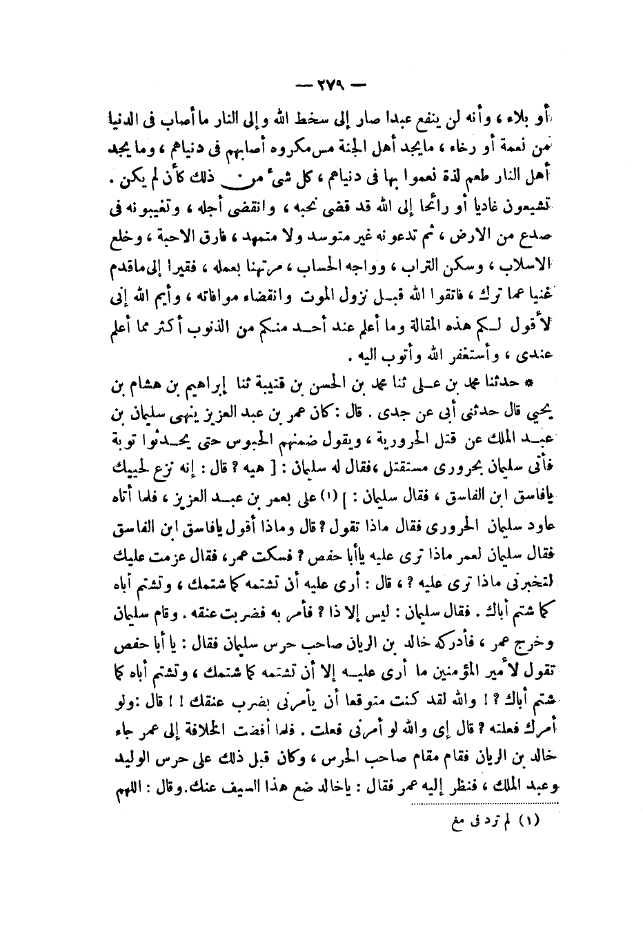 حَدَّثَنَا مُحَمَّدُ بْنُ عَلِيٍّ، ثَنَا مُحَمَّدُ بْنُ الْحَسَنِ بْنِ قُتَيْبَةَ، ثَنَا إِبْرَاهِيمُ بْنُ هِشَامِ بْنِ يَحْيَى قَالَ: حَدَّثَنِي أَبِي، عَنْ جَدِّي قَالَ: كَانَ عُمَرُ بْنُ عَبْدِ الْعَزِيزِ يَنْهَى سُلَيْمَانَ بْنَ عَبْدِ الْمَلِكِ عَنْ قَتْلِ الْحَرُورِيَّةِ وَيقُولُ: ضَمِّنْهُمُ الْحُبُوسَ حَتَّى يُحْدِثُوا تَوْبَةً، فَأَتِيَ سُلَيْمَانُ بِحَرُورِيٍّ مُسْتَقْتِلٍ، فَقَالَ لَهُ سُلَيْمَانُ: هِيهِ، قَالَ: إِنَّهُ نَزَعَ لِحْيَيْكَ يَا فَاسِقُ ابْنُ الْفَاسِقِ، فَقَالَ سُلَيْمَانُ: عَلَيَّ بِعُمَرَ بْنِ عَبْدِ الْعَزِيزِ، فَلَمَّا أَتَاهُ عَاوَدَ سُلَيْمَانُ الْحَرُورِيَّ فَقَالَ: مَاذَا تَقُولُ؟ قَالَ: وَمَاذَا أَقُولُ يَا فَاسِقُ ابْنُ الْفَاسِقِ، فَقَالَ سُلَيْمَانُ لِعُمَرَ: مَاذَا تَرَى عَلَيْهِ يَا أَبَا حَفْصٍ؟، فَسَكَتَ عُمَرُ، فَقَالَ: عَزَمْتُ عَلَيْكَ لَتُخْبِرَنِّي مَاذَا تَرَى عَلَيْهِ قَالَ: §أَرَى عَلَيْهِ أَنْ تَشْتُمَهُ كَمَا شَتَمَكَ، وَتَشْتُمَ أَبَاهُ كَمَا شَتَمَ أَبَاكَ، فَقَالَ سُلَيْمَانُ: لَيْسَ إِلَّا ذَا، فَأَمَرَ بِهِ فَضُرِبَتْ عُنُقُهُ، وَقَامَ سُلَيْمَانُ وَخَرَجَ عُمَرُ، فَأَدْرَكَهُ خَالِدُ بْنُ الرَّيَّانِ صَاحِبُ حَرَسِ سُلَيْمَانَ، فَقَالَ: يَا أَبَا حَفْصٍ، تَقُولُ لِأَمِيرِ الْمُؤْمِنِينَ مَا أَرَى عَلَيْهِ إِلَّا أَنْ تَشْتُمَهُ كَمَا شَتَمَكَ، وَتَشْتُمَ أَبَاهُ كَمَا شَتَمَ أَبَاكَ؟ وَاللهِ لَقَدْ كُنْتُ مُتَوَقِّعًا أَنْ يَأْمُرَنِي بِضَرْبِ عُنُقِكَ، قَالَ: وَلَوْ أَمَرَكَ فَعَلْتَهُ؟ قَالَ: إِي وَاللهِ لَوْ أَمَرَنِي فَعَلْتُ، فَلَمَّا أَفَضَتِ الْخِلَافَةُ إِلَى عُمَرَ جَاءَ خَالِدَ بْنَ الرَّيَّانِ، فَقَامَ مَقَامَ صَاحِبِ الْحَرَسِ، وَكَانَ قَبْلَ ذَلِكَ عَلَى حَرَسِ الْوَلِيدِ، وَعَبْدِ الْمَلِكِ، فَنَظَرَ إِلَيْهِ عُمَرُ فَقَالَ: يَا خَالِدُ، ضَعْ هَذَا السَّيْفَ عَنْكَ، وَقَالَ: اللهُمَّ -[280]- إِنِّي قَدْ وَضَعْتُ لَكَ خَالِدَ بْنَ الرَّيَّانِ فَلَا تَرْفَعْهُ أَبَدًا، ثُمَّ نَظَرَ فِي وُجُوهِ الْحَرَسِ، فَدَعَا عَمْرَو بْنَ مُهَاجِرٍ الْأَنْصَارِيَّ فَقَالَ: يَا عَمْرُو وَاللهِ لَتَعْلَمَنَّ أَنَّ مَا بَيْنِي وَبَيْنَكَ قَرَابَةٌ إِلَّا قَرَابَةُ الْإِسْلَامِ، وَلَكِنْ قَدْ سَمِعْتُكَ تُكْثِرُ تِلَاوَةَ الْقُرْآنِ، وَرَأَيْتُكَ تُصَلِّي فِي مَوْضِعٍ تَظُنُّ أَنْ لَا يَرَاكَ أَحَدٌ، فَرَأَيْتُكَ تُحْسِنُ الصَّلَاةَ، وَأَنْتُ رَجُلٌ مِنَ الْأَنْصَارِ، خُذْ هَذَا السَّيْفَ فَقَدْ وَلَّيْتُكَ حَرَسِي "