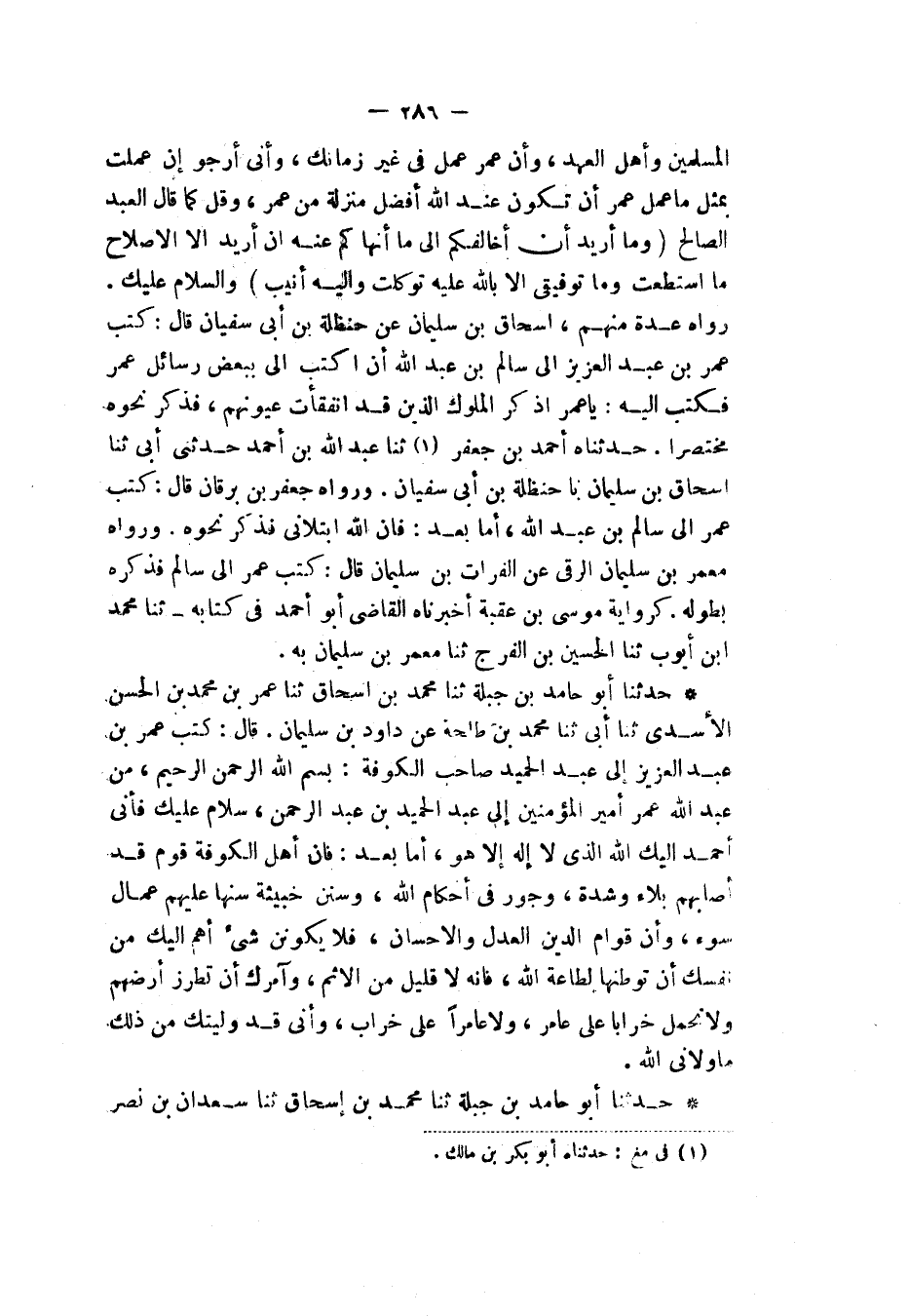 حَدَّثَنَا أَبُو حَامِدِ بْنُ جَبَلَةَ، ثَنَا مُحَمَّدُ بْنُ إِسْحَاقَ، ثَنَا عُمَرُ بْنُ مُحَمَّدِ بْنِ الْحَسَنِ الْأَسَدِيُّ، ثنا أَبِي، ثَنَا مُحَمَّدُ بْنُ طَلْحَةَ، عَنْ دَاوُدَ بْنِ سُلَيْمَانَ قَالَ: كَتَبَ عُمَرُ بْنُ عَبْدِ الْعَزِيزِ إِلَى عَبْدِ الْحَمِيدِ صَاحِبِ الْكُوفَةِ: بِسْمِ اللهِ الرَّحْمَنِ الرَّحِيمِ " مِنْ عَبْدِ اللهِ عُمَرَ أَمِيرِ الْمُؤْمِنِينَ إِلَى عَبْدِ الْحَمِيدِ بْنِ عَبْدِ الرَّحْمَنِ، سَلَامٌ عَلَيْكَ، فَإِنِّي أَحْمَدُ إِلَيْكَ اللهَ الَّذِي لَا إِلَهَ إِلَّا هُوَ، أَمَّا بَعْدُ: §فَإِنَّ أَهْلَ الْكُوفَةِ قَوْمٌ قَدْ أَصَابَهُمْ بَلَاءٌ وَشِدَّةٌ وَجَوْرٌ فِي أَحْكَامِ اللهِ، وَسُنَنٌ خَبِيثَةٌ سَنَّهَا عَلَيْهِمْ عُمَّالُ سُوءٍ، وَأَنَّ قِوَامَ الدِّينِ الْعَدْلُ وَالْإِحْسَانُ، فَلَا يَكُونَنَّ شَيْءٌ أَهَمَّ إِلَيْكَ مِنْ نَفْسِكَ أَنْ تُوَطِّنَهَا لِطَاعَةِ اللهِ، فَإِنَّهُ لَا قَلِيلَ مِنَ الْإِثْمِ، وَآمُرَكَ أَنْ تُطَرِّزَ أَرْضَهُمْ، وَلَا تَحْمِلْ خَرَابًا عَلَى عَامِرٍ، وَلَا عَامِرًا عَلَى خَرَابٍ، وَأَنِّي قَدْ وَلَّيْتُكَ مِنْ ذَلِكَ مَا وَلَّانِي اللهُ "
