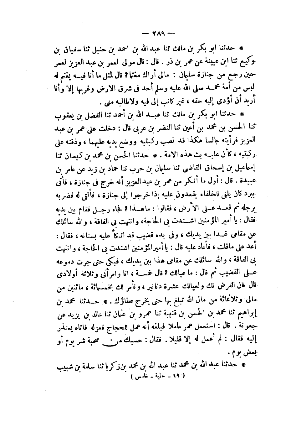 حَدَّثَنَا الْحَسَنُ بْنُ مُحَمَّدِ بْنِ كَيْسَانَ، ثَنَا إِسْمَاعِيلُ بْنُ إِسْحَاقَ الْقَاضِي، ثَنَا سُلَيْمَانُ بْنُ حَرْبٍ، ثَنَا حَمَّادُ بْنُ زَيْدٍ، عَنْ عَامِرِ بْنِ عُبَيْدَةَ قَالَ: أَوَّلُ مَا أُنْكِرَ مِنْ عُمَرَ بْنِ عَبْدِ الْعَزِيزِ أَنَّهُ خَرَجَ فِي جَنَازَةٍ فَأَتَى بِبُرْدٍ كَانَ يُلْقَى لِلْخُلَفَاءِ يَقْعُدُونَ عَلَيْهِ إِذَا خَرَجُوا إِلَى جَنَازَةٍ، فَأُلْقِيَ لَهُ، فَضَرَبَهُ بِرِجْلِهِ ثُمَّ قَعَدَ عَلَى الْأَرْضِ، فَقَالُوا: مَا هَذَا؟ فَجَاءَ رَجُلٌ فَقَامَ بَيْنَ يَدَيْهِ فَقَالَ: §يَا أَمِيرَ الْمُؤْمِنِينَ، اشْتَدَّتْ بِي الْحَاجَةُ وَانْتَهَتْ بِي الْفَاقَةُ، وَاللهُ سَائِلُكَ عَنْ مَقَامِي غَدًا بَيْنَ يَدَيْكَ - وَفِي يَدِهِ قَضِيبٌ قَدِ اتَّكَأَ عَلَيْهِ بِسِنَانِهِ - فَقَالَ: «أَعِدْ عَلَيَّ مَا قُلْتَ» فَأَعَادَ عَلَيْهِ قَالَ: يَا أَمِيرَ الْمُؤْمِنِينَ، اشْتَدَّتْ بِي الْحَاجَةُ، وَانْتَهَتْ بِي الْفَاقَةُ، وَاللهُ سَائِلُكَ عَنْ مَقَامِي هَذَا بَيْنَ يَدَيْكَ، فَبَكَى حَتَّى جَرَتْ دُمُوعُهُ عَلَى الْقَضِيبِ، ثُمَّ قَالَ: «مَا عِيَالُكَ؟» قَالَ: خَمْسَةٌ أَنَا وَامْرَأَتِي وَثَلَاثَةٌ أَوْلَادِي، قَالَ: «فَإِنَّ الْفَرْضَ لَكَ وَلِعِيَالِكَ عَشَرَةُ دَنَانِيرَ، وَنَأْمُرُ لَكَ بِخَمْسِمِائَةٍ، مِائَتَيْنِ مِنْ مَالِي، وَثَلَاثِمِائَةٍ مِنْ مَالِ اللهِ، تَبْلُغُ بِهَا حَتَّى يَخْرُجَ عَطَاؤُكَ»