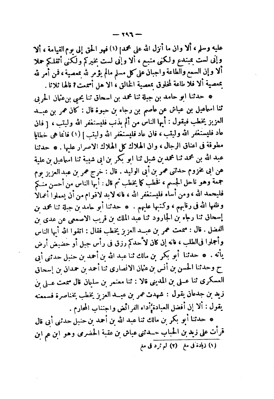 حَدَّثَنَا أَبُو بَكْرِ بْنُ مَالِكٍ، ثَنَا عَبْدُ اللهِ بْنُ أَحْمَدَ بْنِ حَنْبَلٍ، حَدَّثَنِي أَبِي ح وَحَدَّثَنَا الْحَسَنُ بْنُ أَنَسِ بْنِ عُثْمَانَ الْأَنْصَارِيُّ، ثَنَا أَحْمَدُ بْنُ حِمْدَانَ بْنِ إِسْحَاقَ الْعَسْكَرِيُّ، ثَنَا عَلِيُّ بْنُ الْمَدِينِيِّ قَالَا: ثَنَا مُعْتَمِرُ بْنُ سُلَيْمَانَ قَالَ: سَمِعْتُ عَلِيَّ بْنَ زَيْدِ بْنِ جُدْعَانَ يَقُولُ: شَهِدْتُ عُمَرَ بْنَ عَبْدِ الْعَزِيزِ يَخْطُبُ بِخُنَاصِرَةَ فَسَمِعْتُهُ يَقُولُ: «§أَلَا إِنَّ أَفْضَلَ الْعِبَادَةِ أَدَاءُ الْفَرَائِضِ، وَاجْتِنَابُ الْمَحَارِمِ»