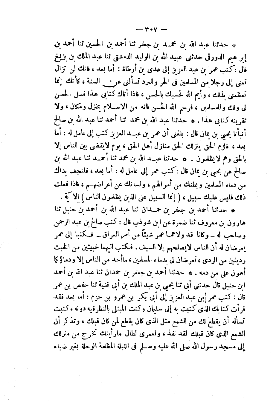 حَدَّثَنَا أَحْمَدُ بْنُ جَعْفَرِ بْنِ حَمْدَانَ، ثنا عَبْدُ اللهِ بْنُ أَحْمَدَ بْنِ حَنْبَلٍ قَالَ: حَدَّثَنِي أَبِي، ثنا يَحْيَى بْنُ عَبْدِ الْمَلِكِ بْنِ أَبِي غَنِيَّةَ، ثنا حَفْصُ بْنُ عُمَرَ قَالَ: كَتَبَ عُمَرُ بْنُ عَبْدِ الْعَزِيزِ إِلَى أَبِي بَكْرِ بْنِ عَمْرِو بْنِ حَزْمٍ: " أَمَّا بَعْدُ §فَقَدْ قَرَأْتُ كِتَابَكَ الَّذِي كَتَبْتَ بِهِ إِلَى سُلَيْمَانَ، وَكُنْتُ الْمُبْتَلَى بِالنَّظَرِ فِيهِ دُونَهُ، كَتَبْتَ تَسْأَلُهُ أَنْ يَقْطَعَ لَكَ مِنَ الشَّمْعِ مِثْلَ الَّذِي كَانَ يَقْطَعُ لِمَنْ كَانَ قَبْلَكَ، وَتَذْكُرُ أَنَّ الشَّمْعَ الَّذِي كَانَ قَبْلَكَ لَقَدْ نَفِدَ، وَلَعَمْرِي لَطَالَمَا رَأَيْتُكَ تَخْرُجُ مِنْ مَنْزِلِكَ إِلَى مَسْجِدِ رَسُولِ اللهِ صَلَّى اللهُ عَلَيْهِ وَسَلَّمَ فِي اللَّيْلَةِ الْمُظْلِمَةِ الْوَحِلَةِ بِغَيْرِ ضِيَاءٍ -[308]-، فَلَعَمْرِي لَأَنْتَ يَوْمَئِذٍ خَيْرٌ مِنْكَ الْيَوْمَ وَالسَّلَامُ عَلَيْكَ