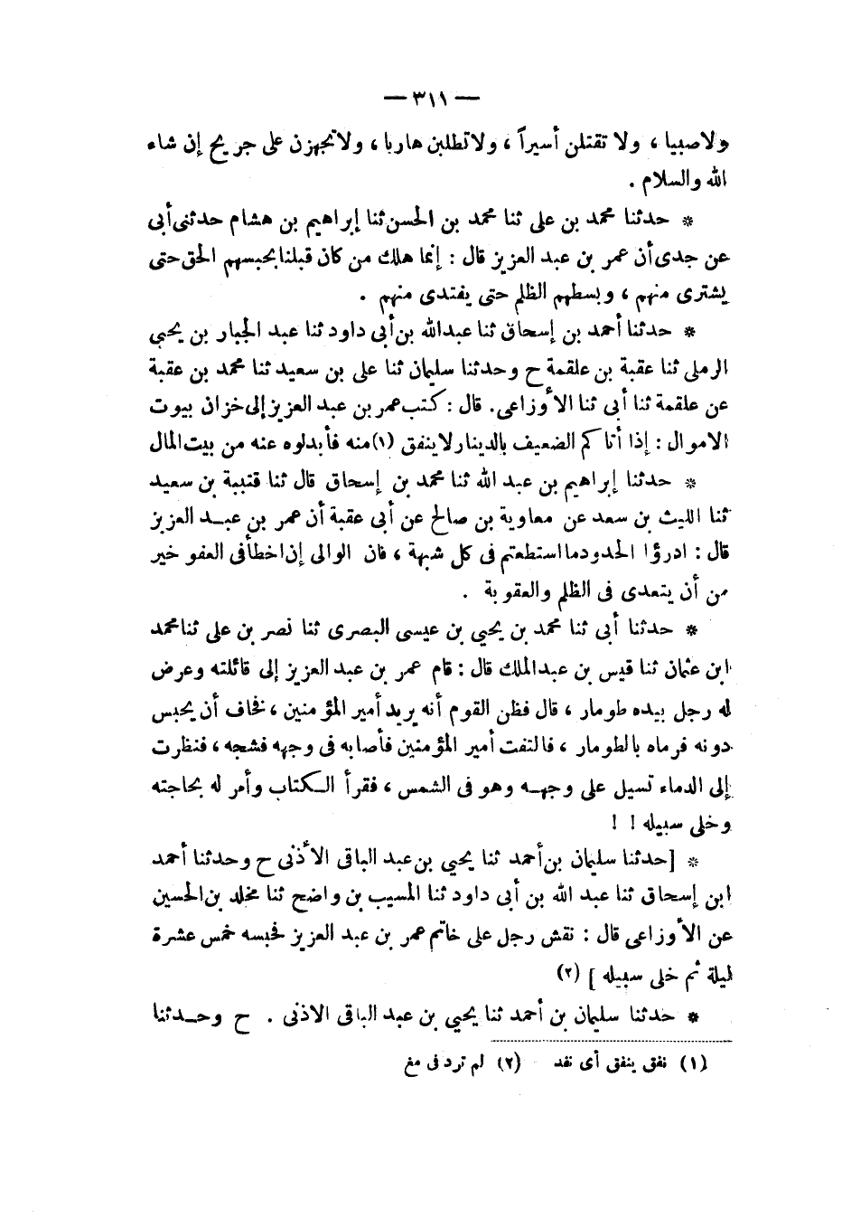 حَدَّثَنَا سُلَيْمَانُ بْنُ أَحْمَدَ، ثنا يَحْيَى بْنُ عَبْدِ الْبَاقِي الْأَذَنِيُّ ح وَحَدَّثَنَا -[312]- أَحْمَدُ بْنُ إِسْحَاقَ، ثنا عَبْدُ اللهِ بْنُ أَبِي دَاوُدَ قَالَا: ثنا الْمُسَيَّبُ بْنُ وَاضِحٍ، ثنا مَخْلَدُ بْنُ الْحُسَيْنِ، عَنِ الْأَوْزَاعِيِّ قَالَ: كَتَبَ عُمَرُ بْنُ عَبْدِ الْعَزِيزِ إِلَى بَعْضِ عُمَّالِهِ «§أَنْ فَادِ بِأُسَارَى الْمُسْلِمِينَ وَإِنْ أَحَاطَ ذَلِكَ بِجَمِيعِ مَالِهِمْ»