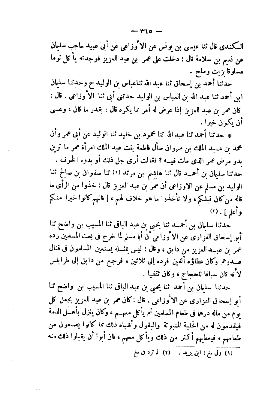 حَدَّثَنَا سُلَيْمَانُ بْنُ أَحْمَدَ، ثنا يَحْيَى بْنُ عَبْدِ الْبَاقِي، ثنا الْمُسَيَّبُ بْنُ وَاضِحٍ، ثنا أَبُو إِسْحَاقَ الْفَزَارِيُّ، عَنِ الْأَوْزَاعِيِّ قَالَ: كَانَ عُمَرُ بْنُ عَبْدِ الْعَزِيزِ يَجْعَلُ كُلَّ يَوْمٍ مِنْ مَالِهِ دِرْهَمًا فِي طَعَامِ الْمُسْلِمِينَ، ثُمَّ يَأْكُلُ مَعَهُمْ §وَكَانَ يَنْزِلُ بِأَهْلِ الذِّمَّةِ فَيُقَدِّمُونَ لَهُ مِنَ الْحِلْبَةِ الْمَنْبُوتَةِ وَالْبُقُولِ وَأَشْبَاهِ ذَلِكَ مِمَّا كَانُوا يَصْنَعُونَ مِنْ طَعَامِهِمْ فَيُعْطِيهِمْ أَكْثَرَ مِنْ ذَلِكَ وَيَأْكُلُ مَعَهُمْ، فَإِنْ أَبَوْا أَنْ يَقْبَلُوا ذَلِكَ مِنْهُ -[316]- لَمْ يَأْكُلْ مِنْهُ، فَأَمَّا مِنَ الْمُسْلِمِينَ فَلَمْ يَكُنْ يَقْبَلُ شَيْئًا "