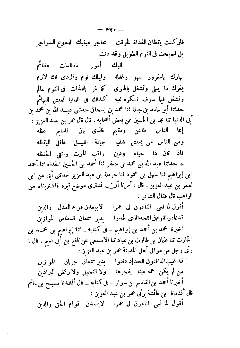 حَدَّثَنَا أَبُو حَامِدِ بْنُ جَبَلَةَ، ثنا مُحَمَّدُ بْنُ إِسْحَاقَ، حَدَّثَنِي عَبْدُ اللهِ بْنُ مُحَمَّدِ بْنِ أَبِي الدُّنْيَا، ثنا مُحَمَّدُ بْنُ الْحُسَيْنِ، عَنْ بَعْضِ أَصْحَابِهِ قَالَ: قَالَ عُمَرُ بْنُ عَبْدِ الْعَزِيزِ:
