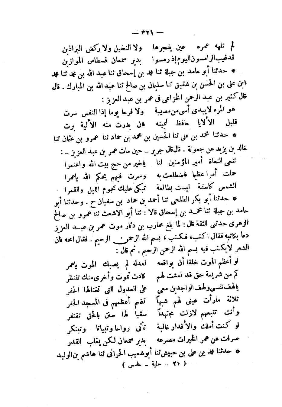 حَدَّثَنَا أَبُو بَكْرٍ الطَّلْحِيُّ، ثنا أَحْمَدُ بْنُ حَمَّادِ بْنِ سُفْيَانَ، ح. وَحَدَّثَنَا أَبُو حَامِدِ بْنُ جَبَلَةَ، ثنا مُحَمَّدُ بْنُ إِسْحَاقَ قَالَا: ثنا أَبُو الْأَشْعَثِ، ثنا عَمْرُو بْنُ صَالِحٍ الزُّهْرِيُّ، حَدَّثَنِي الثِّقَةُ قَالَ: " لَمَّا بَلَغَ مُحَارِبُ بْنُ دِثَارٍ مَوْتَ عُمَرَ بْنِ عَبْدِ الْعَزِيزِ دَعَا بِكَاتِبِهِ فَقَالَ: اكْتُبْ فَكَتَبَ: §بِسْمِ اللهِ الرَّحْمَنِ الرَّحِيمِ، فَقَالَ: امْحُهُ، فَإِنَّ الشِّعْرَ لَا يُكْتَبُ فِيهِ: بِسْمِ اللهِ الرَّحْمَنِ الرَّحِيمِ، ثُمَّ قَالَ