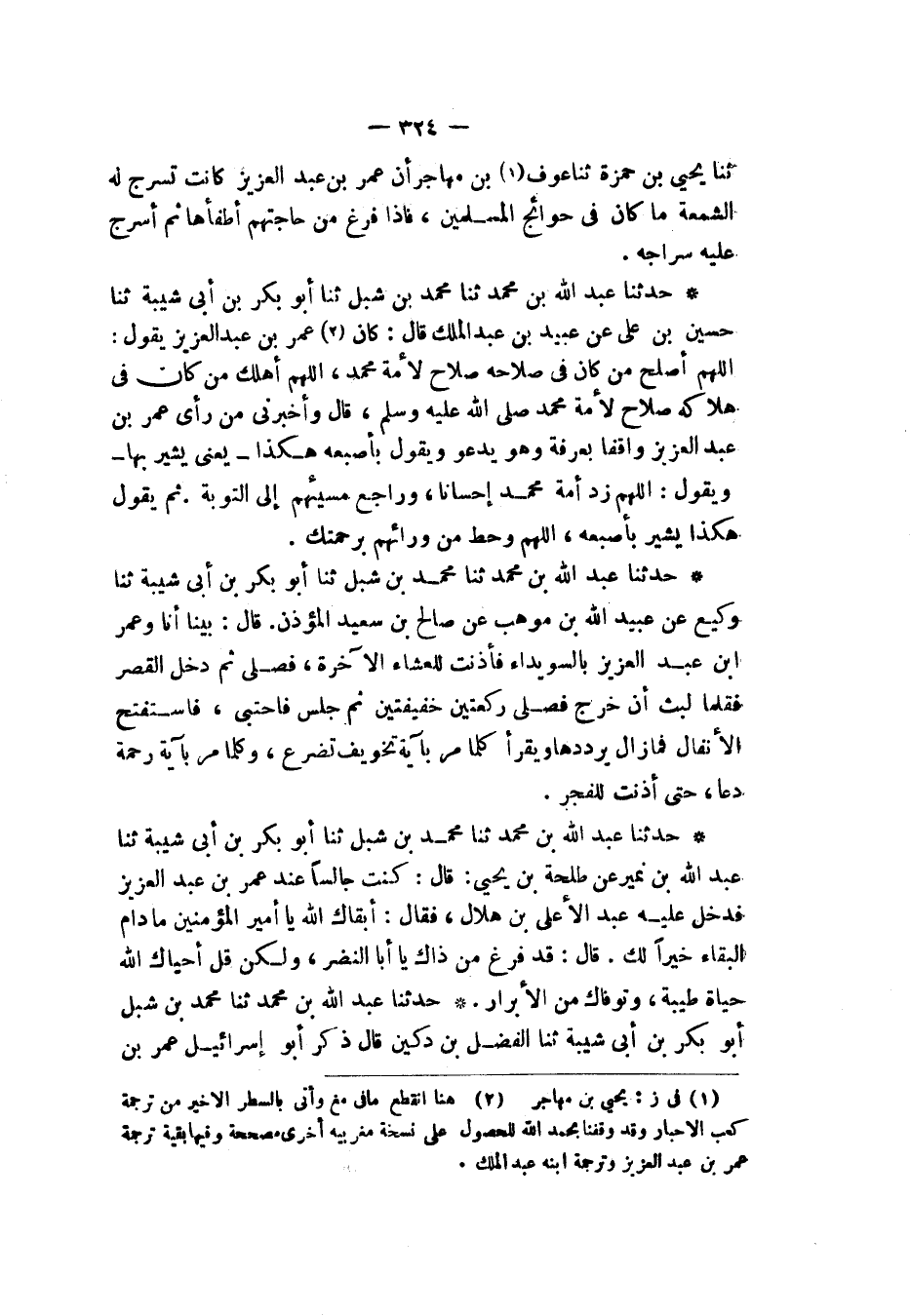 حَدَّثَنَا عَبْدُ اللهِ بْنُ مُحَمَّدٍ، ثنا مُحَمَّدُ بْنُ شِبْلٍ، ثنا أَبُو بَكْرِ بْنُ أَبِي شَيْبَةَ، ثنا حُسَيْنُ بْنُ عَلِيٍّ، عَنْ عُبَيْدِ بْنِ عَبْدِ الْمَلِكِ قَالَ: كَانَ عُمَرُ بْنُ عَبْدِ الْعَزِيزِ يَقُولُ: «§اللهُمَّ أَصْلِحْ مَنْ كَانَ فِي صَلَاحِهِ صَلَاحٌ لَأُمَّةِ مُحَمَّدٍ، اللهُمَّ أَهْلِكْ مَنْ كَانَ فِي هَلَاكِهِ صَلَاحٌ لَأُمَّةِ مُحَمَّدٍ صَلَّى اللهُ عَلَيْهِ وَسَلَّمَ» قَالَ: وَأَخْبَرَنِي مَنْ رَأَى عُمَرَ بْنَ عَبْدِ الْعَزِيزِ وَاقِفًا بِعَرَفَةَ وَهُوَ يَدْعُو وَيَقُولُ بِأُصْبُعِهِ هَكَذَا - يَعْنِي يُشِيرُ بِهَا - وَيَقُولُ: اللهُمَّ زِدْ أُمَّةَ مُحَمَّدٍ إِحْسَانًا، وَرَاجِعْ مُسِيئَهُمْ إِلَى التَّوْبَةِ، ثُمَّ يَقُولُ هَكَذَا يُشِيرُ بِأُصْبُعِهِ: اللهُمَّ وَحُطَّ مِنْ وَرَائِهِمْ بِرَحْمَتِكَ "