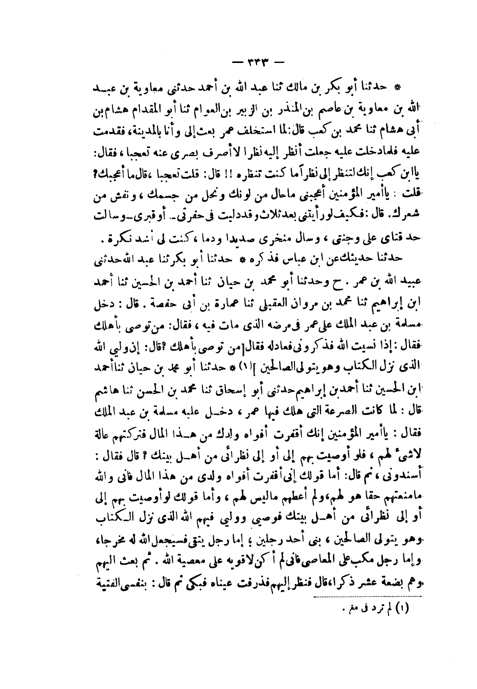 حَدَّثَنَا أَبُو مُحَمَّدِ بْنُ حَيَّانَ، ثنا أَحْمَدُ بْنُ الْحُسَيْنِ، ثنا أَحْمَدُ بْنُ إِبْرَاهِيمَ، حَدَّثَنِي أَبُو إِسْحَاقَ، ثنا مُحَمَّدُ بْنُ الْحَسَنِ، ثنا هَاشِمٌ قَالَ: لَمَّا كَانَتِ الصَّرْعَةُ الَّتِي هَلَكَ فِيهَا عُمَرُ دَخَلَ عَلَيْهِ مَسْلَمَةُ بْنُ عَبْدِ الْمَلِكِ فَقَالَ: يَا أَمِيرَ الْمُؤْمِنِينَ إِنَّكَ أَقْفَرْتَ أَفْوَاهَ وَلَدِكَ مِنْ هَذَا الْمَالِ فَتَرَكْتَهُمْ عَالَةً لَا شَيْءَ لَهُمْ، فَلَوْ أَوْصَيْتَ بِهِمْ إِلَيَّ أَوْ إِلَى نُظَرَائِي مِنْ أَهْلِ بَيْتِكَ، قَالَ: فَقَالَ: أَسْنِدُونِي ثُمَّ قَالَ: " أَمَّا قَوْلُكَ إِنِّي أَقْفَرْتُ أَفْوَاهَ وَلَدِي مِنْ هَذَا الْمَالِ فَإِنِّي §وَاللهِ مَا مَنَعْتُهُمْ حَقًّا هُوَ لَهُمْ، وَلَمْ أُعْطِهِمْ مَا لَيْسَ لَهُمْ، وَأَمَّا قَوْلُكَ لَوْ أَوْصَيْتَ بِهِمْ إِلَيَّ أَوْ إِلَى نُظَرَائِي مِنْ أَهْلِ بَيْتِكَ فَوَصِيِّي وَوَلِيِّي فِيهِمُ اللهُ الَّذِي نَزَّلَ الْكِتَابَ وَهُوَ يَتَوَلَّى الصَّالِحِينَ، بَنِيَّ أَحَدُ رَجُلَيْنِ: إِمَّا رَجُلٌ يَتَّقِي فَسَيَجْعَلُ اللهُ لَهُ مَخْرَجًا، وَإِمَّا رَجُلٌ مُكِبٌّ عَلَى الْمَعَاصِي فَإِنِّي لَمْ أَكُنْ لِأُقَوِّيَهُ عَلَى مَعْصِيَةِ اللهِ. ثُمَّ بَعَثَ إِلَيْهِمْ وَهُمْ بَضْعَةَ عَشَرَ ذَكَرًا قَالَ: فَنَظَرَ إِلَيْهِمْ فَذَرَفَتْ عَيْنَاهُ فَبَكَى ثُمَّ قَالَ: بِنَفْسِي الْفِتْيَةُ -[334]- الَّذِينَ تَرَكْتُهُمْ عَيْلَى لَا شَيْءَ لَهُمْ، بَلَى بِحَمْدِ اللهِ قَدْ تَرَكْتُهُمْ بِخَيْرٍ، أَيْ بَنِيَّ إِنَّكُمْ لَنْ تَلْقَوْا أَحَدًا مِنَ الْعَرَبِ وَلَا مِنَ الْمُعَاهَدِينَ إِلَّا كَانَ لَكُمْ عَلَيْهِمْ حَقًّا، أَيْ بَنِيَّ إِنَّ أَمَامَكُمْ مَيْلٌ بَيْنَ أَمْرَيْنِ، بَيْنَ أَنْ تَسْتَغْنُوا وَيدْخُلَ أَبُوكُمُ النَّارَ، وَأَنْ تَفْتَقِرُوا وَيَدْخُلَ أَبُوكُمُ الْجَنَّةَ، فَكَانَ أَنْ تَفْتَقِرُوا وَيَدْخُلَ أَبُوكُمُ الْجَنَّةَ أَحَبَّ إِلَيْهِ مِنْ أَنْ تَسْتَغْنُوا وَيدْخُلَ النَّارَ، قُومُوا عَصَمَكُمُ اللهُ "