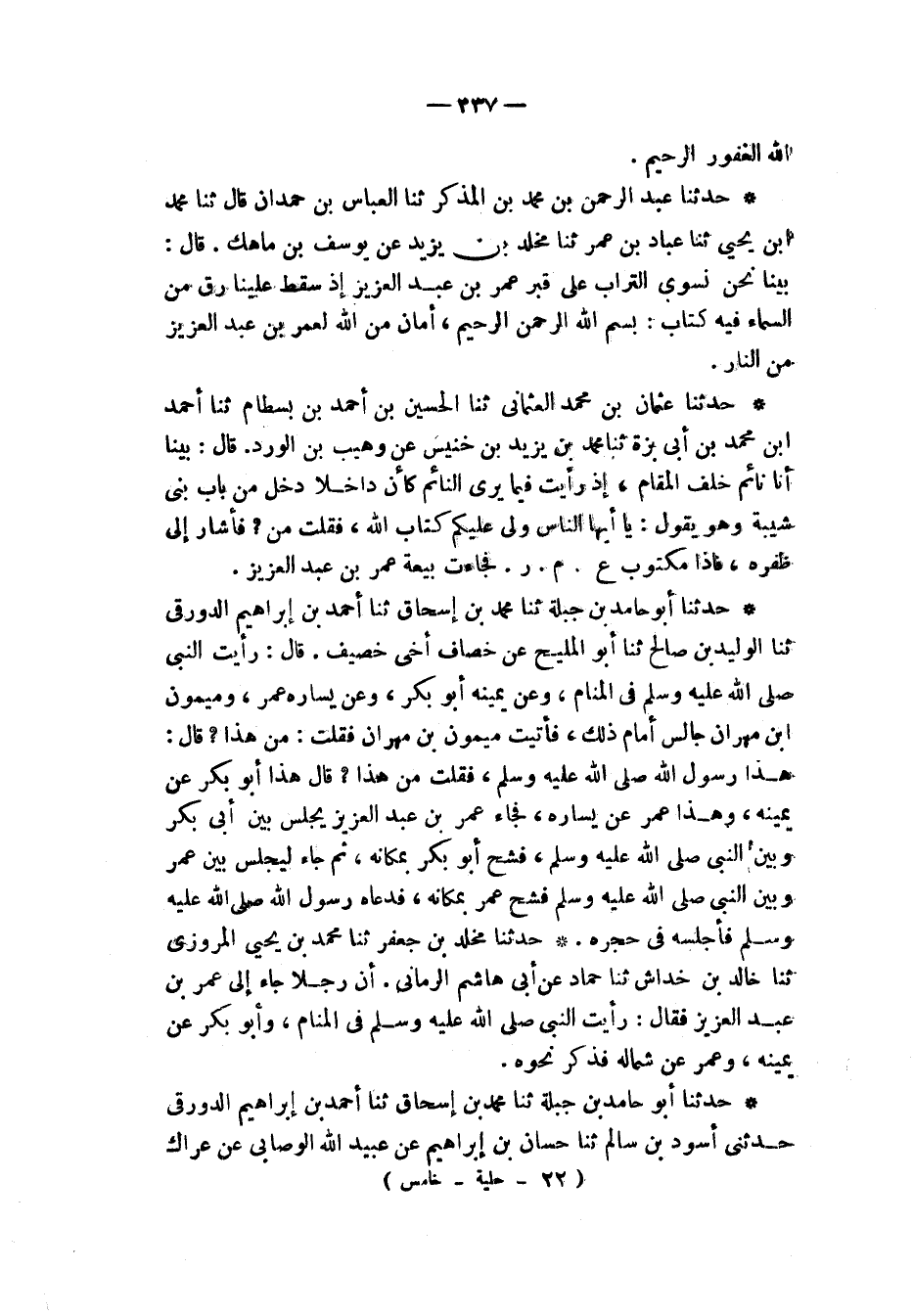 حَدَّثَنَا عَبْدُ الرَّحْمَنِ بْنُ مُحَمَّدِ بْنِ الْمُذَكِّرِ، ثنا الْعَبَّاسُ بْنُ حَمْدَانَ قَالَ: ثنا مُحَمَّدُ بْنُ يَحْيَى، ثنا عَبَّادُ بْنُ عُمَرَ، ثنا مَخْلَدُ بْنُ يَزِيدَ، عَنْ يُوسُفَ بْنِ مَاهَكَ قَالَ: بَيْنَا نَحْنُ نُسَوِّي التُّرَابَ عَلَى قَبْرِ عُمَرَ بْنِ عَبْدِ الْعَزِيزِ إِذْ §سَقَطَ عَلَيْنَا رَقٌّ مِنَ السَّمَاءِ فِيهِ كِتَابٌ: بِسْمِ اللهِ الرَّحْمَنِ الرَّحِيمِ أَمَانٌ مِنَ اللهِ لِعُمَرَ بْنِ عَبْدِ الْعَزِيزِ مِنَ النَّارِ "