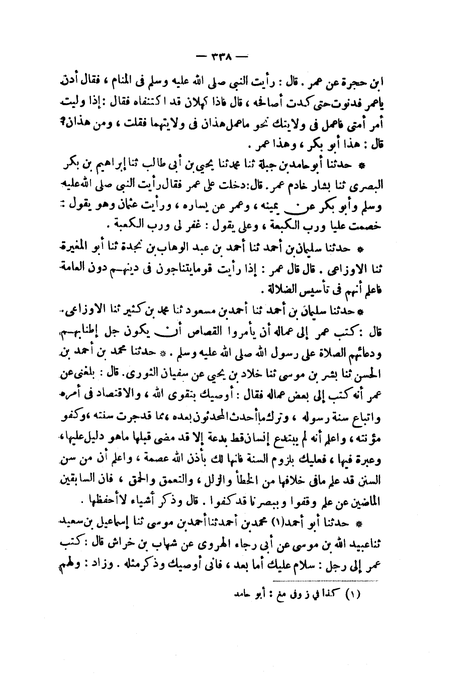 حَدَّثَنَا مُحَمَّدُ بْنُ أَحْمَدَ بْنِ الْحَسَنِ، ثنا بِشْرُ بْنُ مُوسَى، ثنا خَلَّادُ بْنُ يَحْيَى، عَنْ سُفْيَانَ الثَّوْرِيِّ قَالَ: بَلَغَنِي عَنْ عُمَرَ، أَنَّهُ كَتَبَ إِلَى بَعْضِ عُمَّالِهِ فَقَالَ: «§أُوصِيكَ بِتَقْوَى اللهِ، وَالِاقْتِصَادِ فِي أَمْرِهِ وَاتِّبَاعِ سُنَّةِ رَسُولِهِ، وَتَرْكِ مَا أَحْدَثَ الْمُحْدِثُونَ بَعْدَهُ مِمَّا قَدْ جَرَتْ سُنَّتُهُ، وَكُفُّوا مُؤْنَتَهُ، وَاعْلَمْ أَنَّهُ لَمْ يَبْتَدِعْ إِنْسَانٌ قَطُّ بِدْعَةً إِلَّا قَدْ مَضَى قَبْلَهَا مَا هُوَ دَلِيلٌ عَلَيْهَا، وَعِبْرَةٌ فِيهَا، فَعَلَيْكَ بِلُزُومِ السُّنَّةِ فَإِنَّهَا لَكَ بِإِذْنِ اللهِ عِصْمَةٌ، وَاعْلَمْ أَنَّ مَنْ سَنَّ السُّنَنَ قَدْ عَلِمَ مَا فِي خِلَافِهَا مِنَ الْخَطَأِ وَالزَّلَلِ وَالتَّعَمُّقِ وَالْحُمْقِ، فَإِنَّ السَّابِقِينَ الْمَاضِينَ عَنْ عِلْمٍ وَقَفُوا، وَبِبَصَرِنَا قَدْ كَفُّوا» قَالَ: وَذَكَرَ أَشْيَاءَ لَا أَحْفَظُهَا حَدَّثَنَا أَبُو أَحْمَدَ مُحَمَّدُ بْنُ أَحْمَدَ، ثنا أَحْمَدُ بْنُ مُوسَى، ثنا إِسْمَاعِيلُ بْنُ سَعِيدٍ، ثنا عُبَيْدُ اللهِ بْنُ مُوسَى، عَنْ أَبِي رَجَاءٍ الْهَرَوِيِّ، عَنْ شِهَابِ بْنِ خِرَاشٍ قَالَ: كَتَبَ عُمَرُ إِلَى رَجُلٍ: " سَلَامٌ عَلَيْكَ، أَمَّا بَعْدُ فَإِنِّي أُوصِيكَ، وَذَكَرَ مِثْلَهُ وَزَادَ: وَلَهُمْ -[339]- كَانُوا عَلَى كَشْفِ الْأُمُورِ أَقْوَى، وَبِفَضْلٍ لَوْ كَانَ فِيهِ أَحْرَى، فَإِنَّهُمْ هُمُ السَّابِقُونَ، وَلَئِنْ كَانَ الْهُدَى مَا أَنْتُمْ عَلَيْهِ لَقَدْ سَبَقْتُمُوهُمْ إِلَيْهِ، وَلَئِنْ قُلْتُمْ حَدَثَ بَعْدَهُمْ، حَدَثَ مَا أَحْدَثَ إِلَّا مَنِ اتَّبَعَ غَيْرَ سَبِيلِهِمْ، وَرَغِبَ بِنَفْسِهِ عَنْهُمْ، وَلَقَدْ تَكَلَّمُوا مِنْهُ مَا يَكْفِي، وَوَضَعُوا مِنْهُ مَا يَشْفِي، فَمَا دُونَهُمْ مُقَصِّرٌ، وَلَا فَوْقَهُمْ مُحَسِّرٌ، لَقَدْ قَصَّرَ دُونَهُمْ أَقْوَامٌ فَجَفَوْا، وَطَمَحَ عَنْهُمْ آخَرُونَ فَغَلَوْا، وَأَنْتُمْ بَيْنَ ذَلِكَ لَعَلَى هُدًى مُسْتَقِيمٍ "