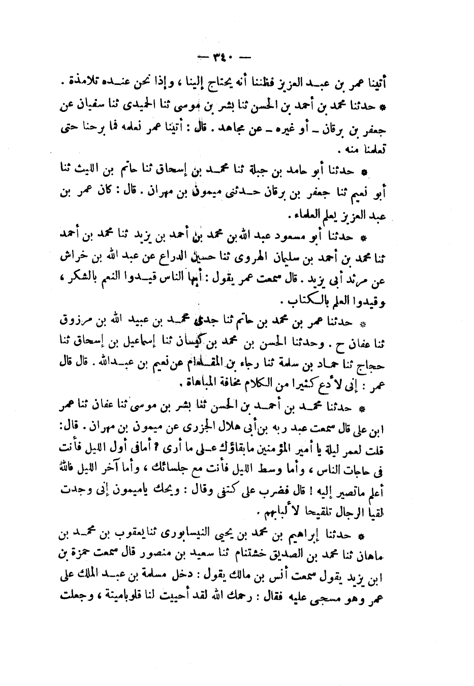 حَدَّثَنَا أَبُو حَامِدِ بْنُ جَبَلَةَ، ثنا مُحَمَّدُ بْنُ إِسْحَاقَ، ثنا حَاتِمُ بْنُ اللَّيْثِ، ثنا أَبُو نُعَيْمٍ، ثنا جَعْفَرُ بْنُ بُرْقَانَ، حَدَّثَنِي مَيْمُونُ بْنُ مِهْرَانَ قَالَ: «§كَانَ عُمَرُ بْنُ عَبْدِ الْعَزِيزِ يُعَلِّمُ الْعُلَمَاءَ»