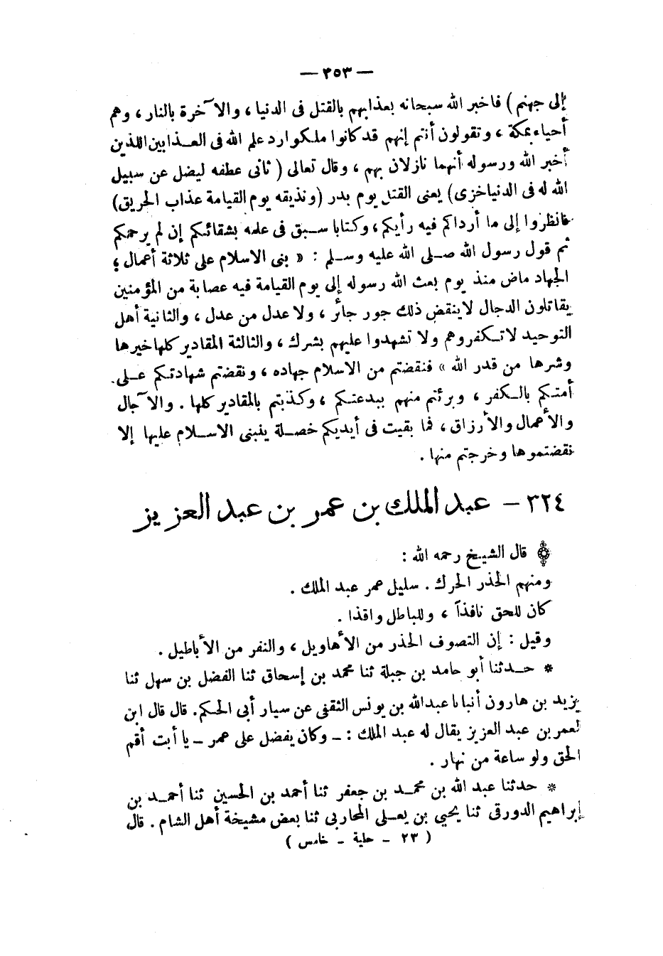 §عَبْدُ الْمَلِكِ بْنُ عُمَرَ بْنِ عَبْدِ الْعَزِيزِ قَالَ الشَّيْخُ رَحِمَهُ اللهُ: وَمِنْهُمُ الْحَذِرُ الْحَرِكُ، سَلِيلُ عُمَرَ بْنِ عَبْدِ الْمَلِكِ كَانَ لِلْحَقِّ نَافِذًا، وَلِلْبَاطِلِ وَاقِذًا. وَقِيلَ: إِنَّ التَّصَوُّفَ الْحَذَرُ مِنَ الْأَهَاوِيلِ وَالنَّفَرُ مِنَ الْأَبَاطِيلِ