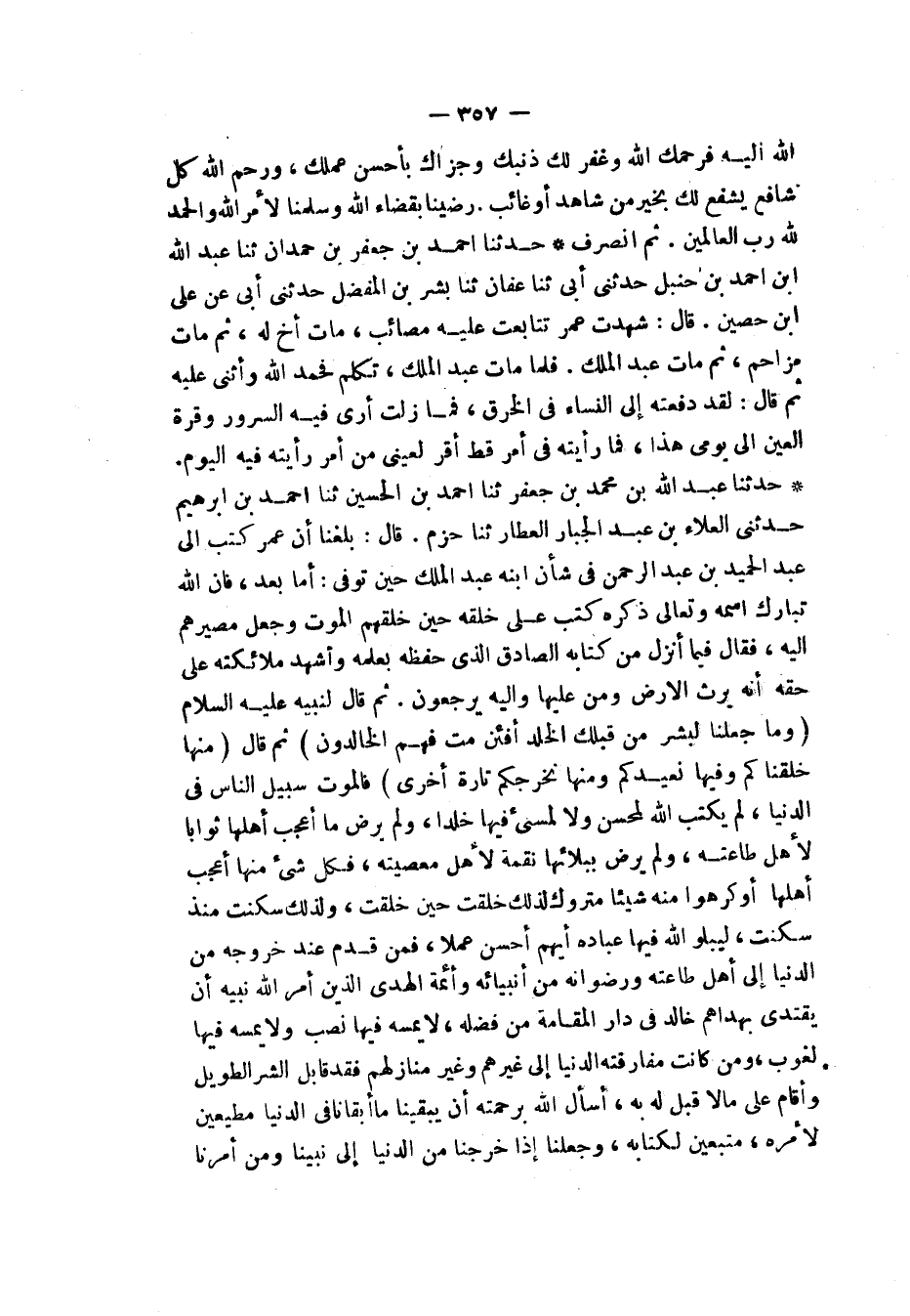 حَدَّثَنَا عَبْدُ اللهِ بْنُ مُحَمَّدِ بْنِ جَعْفَرٍ، ثنا أَحْمَدُ بْنُ الْحُسَيْنِ، ثنا أَحْمَدُ بْنُ إِبْرَاهِيمَ، حَدَّثَنِي الْعَلَاءُ بْنُ عَبْدِ الْجَبَّارِ الْعَطَّارُ، ثنا حَزْمٌ قَالَ: بَلَغَنَا أَنَّ عُمَرَ، كَتَبَ إِلَى عَبْدِ الْحَمِيدِ بْنِ عَبْدِ الرَّحْمَنِ فِي شَأْنِ ابْنِهِ عَبْدِ الْمَلِكِ حِينَ تُوُفِّيَ: " أَمَّا بَعْدُ، فَإِنَّ اللهَ تَبَارَكَ اسْمُهُ، وَتَعَالَى ذِكْرُهُ §كَتَبَ عَلَى خَلْقِهِ حِينَ خَلَقَهُمُ الْمَوْتَ، وَجَعَلَ مَصِيرَهُمْ إِلَيْهِ، فَقَالَ فِيمَا أَنْزَلَ مِنْ كِتَابِهِ الصَّادِقِ الَّذِي حِفِظَهُ بِعِلْمِهِ، وَأَشْهَدَ مَلَائِكَتَهُ عَلَى حَقِّهِ، أَنَّهُ يَرِثُ الْأَرْضَ وَمَنْ عَلَيْهَا وَإِلَيْهِ يُرْجَعُونَ. ثُمَّ قَالَ لِنَبِيِّهِ عَلَيْهِ السَّلَامُ: {وَمَا جَعَلْنَا لِبَشَرٍ مِنْ قَبْلِكَ الْخُلْدُ أَفَإِنْ مُتَّ فَهُمُ الْخَالِدُونَ} [الأنبياء: 34]. ثُمَّ قَالَ: {مِنْهَا خَلَقْنَاكُمْ وَفِيهَا نُعِيدُكُمْ وَمِنْهَا نُخْرِجُكُمْ تَارَةً أُخْرَى} [طه: 55]. فَالْمَوْتُ سَبِيلُ النَّاسِ فِي الدُّنْيَا، لَمْ يَكْتُبِ اللهُ لِمُحْسِنٍ وَلَا لِمُسِيءٍ فِيهَا خُلْدًا، وَلَمْ يَرْضَ مَا أَعْجَبَ أَهْلَهَا ثَوَابًا لِأَهْلِ طَاعَتِهِ، وَلَمْ يَرْضَ بِبَلَائِهَا نِقْمَةً لِأَهْلِ مَعْصِيتِهِ، فَكُلُّ شَيْءٍ مِنْهَا أَعْجَبَ أَهْلَهَا أَوْ كَرِهُوا مِنْهُ شَيْئًا مَتْرُوكٌ، لِذَلِكَ خُلِقَتْ حِينَ خُلِقَتْ، وَلِذَلِكَ سُكِنَتْ مُنْذُ سُكِنَتْ، لِيَبْلُوَ اللهُ فِيهَا عِبَادَهُ أَيُّهُمْ أَحْسَنُ عَمَلًا، فَمَنْ قَدِمَ عِنْدَ خُرُوجِهِ مِنَ الدُّنْيَا إِلَى أَهْلِ طَاعَتِهِ وَرِضْوَانِهِ مِنْ أَنْبِيَائِهِ وَأَئِمَّةِ الْهُدَى الَّذِينَ أَمَرَ اللهُ نَبِيَّهُ أَنْ يَقْتَدِيَ بِهُدَاهُمْ خَالِدٌ فِي دَارِ الْمُقَامَةِ مِنْ فَضْلِهِ، لَا يَمَسُّهُ فِيهَا نَصَبٌ وَلَا يَمَسُّهُ فِيهَا لُغُوبٌ، وَمَنْ كَانَتْ مُفَارَقَتُهُ الدُّنْيَا إِلَى غَيْرِهِمْ وَغَيْرِ مَنَازِلِهِمْ فَقَدْ قَابَلَ الشَّرَّ الطَّوِيلَ، وَأَقَامَ عَلَى مَا لَا قِبَلَ لَهُ بِهِ، أَسْأَلُ اللهَ بِرَحْمَتِهِ أَنْ يُبْقِيَنَا مَا أَبْقَانَا فِي الدُّنْيَا مُطِيعِينَ لَأَمْرِهِ، مُتَّبِعِينَ لِكِتَابِهِ، وَجَعَلَنَا إِذَا خَرَجْنَا مِنَ الدُّنْيَا إِلَى نَبِيِّنَا وَمَنْ أَمَرَنَا -[358]- أَنْ نَقْتَدِيَ بِهُدَاهُ مِنَ الْمُصْطَفَيْنَ الْأَخْيَارِ، وَأَسْأَلُهُ بِرَحْمَتِهِ أَنْ يَقِيَنَا أَعْمَالَ السُّوءِ فِي الدُّنْيَا، وَالسَّيِّئَاتِ يَوْمَ الْقِيَامَةِ. ثُمَّ إِنَّ عَبْدَ الْمَلِكِ ابْنِ أَمِيرِ الْمُؤْمِنِينَ كَانَ عَبْدًا مِنْ عِبَادِ اللهِ، أَحْسَنَ اللهُ إِلَيْهِ فِي نَفْسِهِ، وَأَحْسَنَ إِلَى أَبِيهِ فِيهِ، أَعَاشَهُ اللهُ مَا أَحَبَّ أَنْ يُعِيشَهُ، ثُمَّ قَبَضَهُ إِلَيْهِ حِينَ أَحَبَّ أَنْ يَقْبِضَهُ، وَهُوَ فِيمَا عَلِمْتُ بِالْمَوْتِ مُغْتَبِطٌ، يَرْجُو فِيهِ مِنَ اللهِ رَجَاءً حَسَنًا، فَأَعُوذُ بِاللهِ أَنْ تَكُونَ لِي مَحَبَّةٌ فِي شَيْءٍ مِنَ الْأُمُورِ تُخَالِفُ مَحَبَّةَ اللهِ، فَإِنَّ خِلَافَ ذَلِكَ لَا يَصْلُحُ فِي بَلَائِهِ عِنْدِي وَإِحْسَانِهِ إِلَيَّ، وَنِعْمَتِهِ عَلَيَّ، وَقَدْ قُلْتُ فِيمَا كَانَ مِنْ سَبِيلِهِ، وَالْحَمْدُ لِلَّهِ مَا رَجَوْتُ بِهِ ثَوَابَ اللهِ، وَمَوْعِدَهُ الصَّادِقَ مِنَ الْمَغْفِرَةِ، إِنَّا لِلَّهِ وَإِنَّا إِلَيْهِ رَاجِعُونَ، ثُمَّ لَمْ أَجِدْ وَالْحَمْدُ لِلَّهِ بَعْدَهُ فِي نَفْسِي إِلَّا خَيْرًا مِنْ رِضًي بِقَضَاءِ اللهِ، وَاحْتِسَابٍ لِمَا كَانَ مِنَ الْمُصِيبَةِ، فَحَمْدًا لِلَّهِ عَلَى مَا مَضَى، وَعَلَى مَا بَقِيَ، وَعَلَى كُلِّ حَالٍ مِنْ أَمْرِ الدُّنْيَا وَالْآخِرَةِ. أَحْبَبْتُ أَ