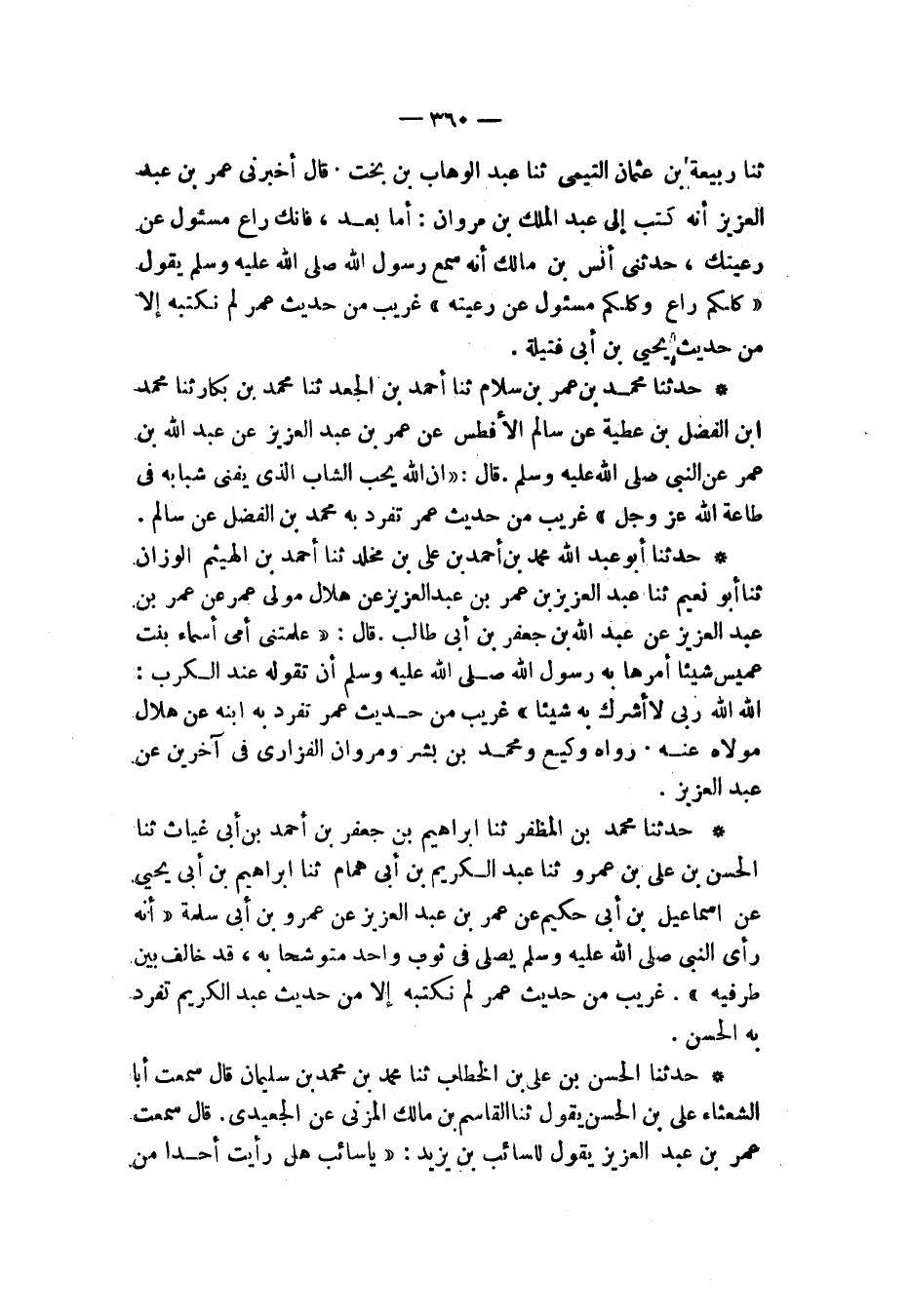 حَدَّثَنَا مُحَمَّدُ بْنُ عُمَرَ بْنِ سَلَّامٍ، ثنا أَحْمَدُ بْنُ الْجَعْدٍ، ثنا مُحَمَّدُ بْنُ بَكَّارٍ، ثنا مُحَمَّدُ بْنُ الْفَضْلِ بْنِ عَطِيَّةَ، عَنْ سَالِمٍ الْأَفْطَسِ، عَنْ عُمَرَ بْنِ عَبْدِ الْعَزِيزِ، عَنْ عَبْدِ اللهِ بْنِ عُمَرَ، عَنِ النَّبِيِّ صَلَّى اللهُ عَلَيْهِ وَسَلَّمَ قَالَ: «§إِنَّ اللهَ يُحِبُّ الشَّابَّ الَّذِي يُفْنِي شَبَابَهُ فِي طَاعَةِ اللهِ عَزَّ وَجَلَّ» غَرِيبٌ مِنْ حَدِيثِ عُمَرَ، تَفَرَّدَ بِهِ مُحَمَّدُ بْنُ الْفَضْلِ، عَنْ سَالِمٍ