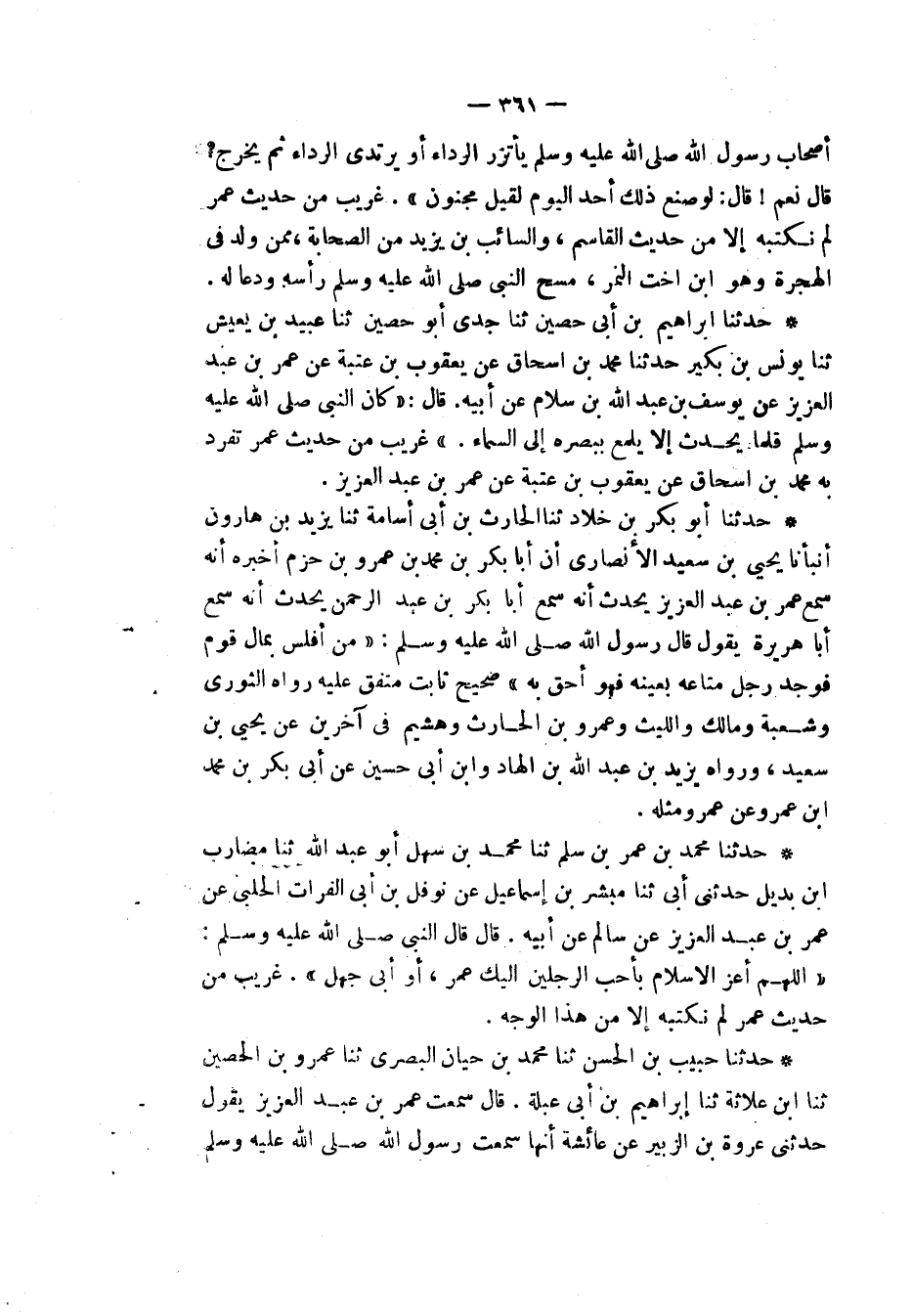حَدَّثَنَا إِبْرَاهِيمُ بْنُ أَبِي حُصَيْنٍ، ثنا جَدِّي أَبُو حُصَيْنٍ، ثنا عُبَيْدُ بْنُ يَعِيشَ، ثنا يُونُسُ بْنُ بُكَيْرٍ، حَدَّثَنَا مُحَمَّدُ بْنُ إِسْحَاقَ، عَنْ يَعْقُوبَ بْنِ عُتْبَةَ، عَنْ عُمَرَ بْنِ عَبْدِ الْعَزِيزِ، عَنْ يُوسُفَ بْنِ عَبْدِ اللهِ بْنِ سَلَامٍ، عَنْ أَبِيهِ قَالَ: كَانَ النَّبِيُّ صَلَّى اللهُ عَلَيْهِ وَسَلَّمَ §قَلَّمَا يُحَدِّثُ إِلَّا يَلْمَعُ بِبَصَرِهِ إِلَى السَّمَاءِ " غَرِيبٌ مِنْ حَدِيثِ عُمَرَ، تَفَرَّدَ بِهِ مُحَمَّدُ بْنُ إِسْحَاقَ، عَنْ يَعْقُوبَ بْنِ عُتْبَةَ، عَنْ عُمَرَ بْنِ عَبْدِ الْعَزِيزِ