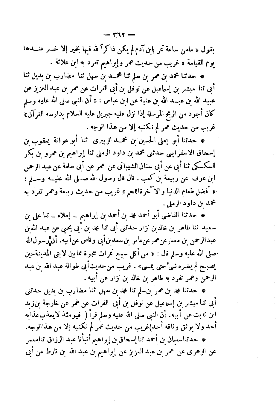 حَدَّثَنَا مُحَمَّدُ بْنُ عُمَرَ بْنِ سَلْمٍ، ثنا مُحَمَّدُ بْنُ سَهْلٍ، ثنا مُضَارِبُ بْنُ بُدَيْلٍ، ثنا أَبِي، ثنا مُبَشِّرُ بْنُ إِسْمَاعِيلَ، عَنْ نَوْفَلِ بْنِ أَبِي الْفُرَاتِ، عَنْ عُمَرَ بْنِ عَبْدِ الْعَزِيزِ، عَنْ عُبَيْدِ اللهِ بْنِ عَبْدِ اللهِ بْنِ عُتْبَةَ، عَنِ ابْنِ عَبَّاسٍ، أَنَّ النَّبِيَّ صَلَّى اللهُ عَلَيْهِ وَسَلَّمَ §كَانَ أَجْوَدَ مِنَ الرِّيحِ الْمُرْسَلَةِ، إِذَا نَزَلَ عَلَيْهِ جِبْرِيلُ عَلَيْهِ السَّلَامُ يُدَارِسُهُ الْقُرْآنَ " غَرِيبٌ مِنْ حَدِيثِ عُمَرَ، لَمْ نَكْتُبْهُ إِلَّا مِنْ هَذَا الْوَجْهِ