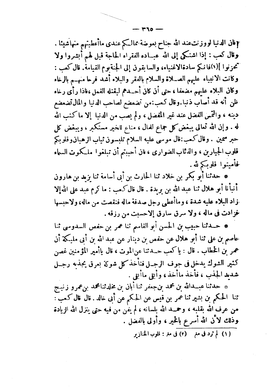 حَدَّثَنَا حَبِيبُ بْنُ الْحَسَنِ أَبُو الْقَاسِمِ، ثنا عُمَرُ بْنُ حَفْصٍ السَّدُوسِيُّ، ثنا عَاصِمُ بْنُ عَلِيٍّ، ثنا أَبُو هِلَالٍ، عَنْ حَفْصِ بْنِ دِينَارٍ، عَنْ عَبْدِ اللهِ بْنِ أَبِي مُلَيْكَةَ، أَنَّ عُمَرَ بْنَ الْخَطَّابِ قَالَ: يَا كَعْبُ حَدِّثْنَا عَنِ الْمَوْتِ قَالَ: «يَا أَمِيرَ الْمُؤْمِنِينَ، §غُصْنٌ كَثِيرُ الشَّوْكِ، يَدْخُلُ فِي جَوْفِ الرَّجُلِ، فَتَأْخُذُ كُلُّ شَوْكَةٍ بِعِرْقٍ يَجْذِبُهُ رَجُلٌ شَدِيدُ الْجَذْبِ، فَأَخَذَ مَا أَخَذَ، وَأَبْقَى مَا أَبْقَى»