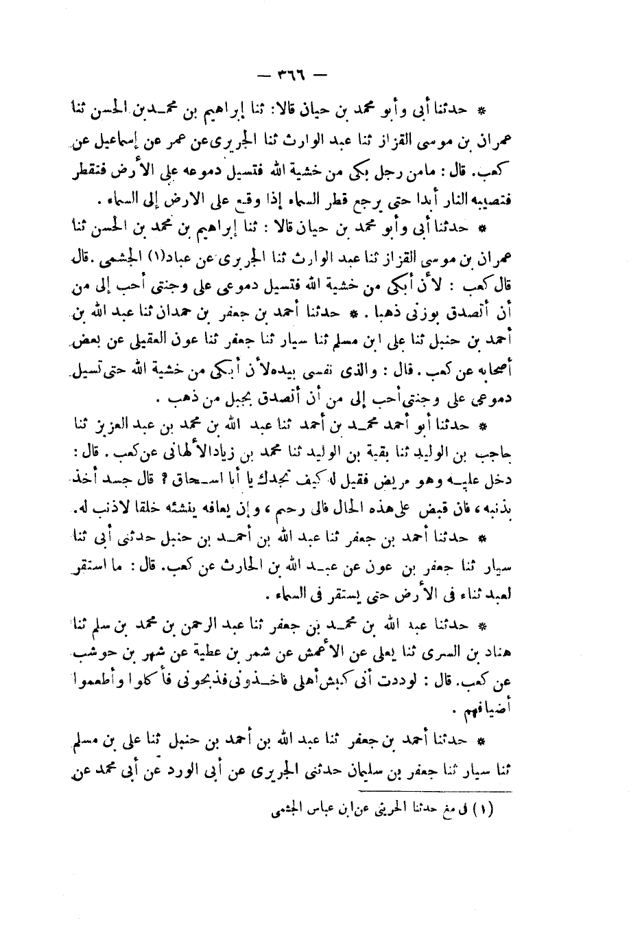 حَدَّثَنَا أَبِي، وَأَبُو مُحَمَّدِ بْنُ حَيَّانَ قَالَا: ثنا إِبْرَاهِيمُ بْنُ مُحَمَّدِ بْنِ الْحَسَنِ، ثنا عِمْرَانُ بْنُ مُوسَى الْقَزَّازُ، ثنا عَبْدُ الْوَرَاثِ، ثنا الْجُرَيْرِيُّ، عَنْ عَبَّادٍ الْجُشَمِيِّ قَالَ: قَالَ كَعْبٌ: «§لَأَنْ أَبْكِيَ مِنْ خَشْيَةِ اللهِ فَتَسِيلَ دُمُوعِي عَلَى وَجْنَتِي أَحَبُّ إِلَيَّ مِنْ أَنْ أَتَصَدَّقَ بِوَزْنِي ذَهَبًا»