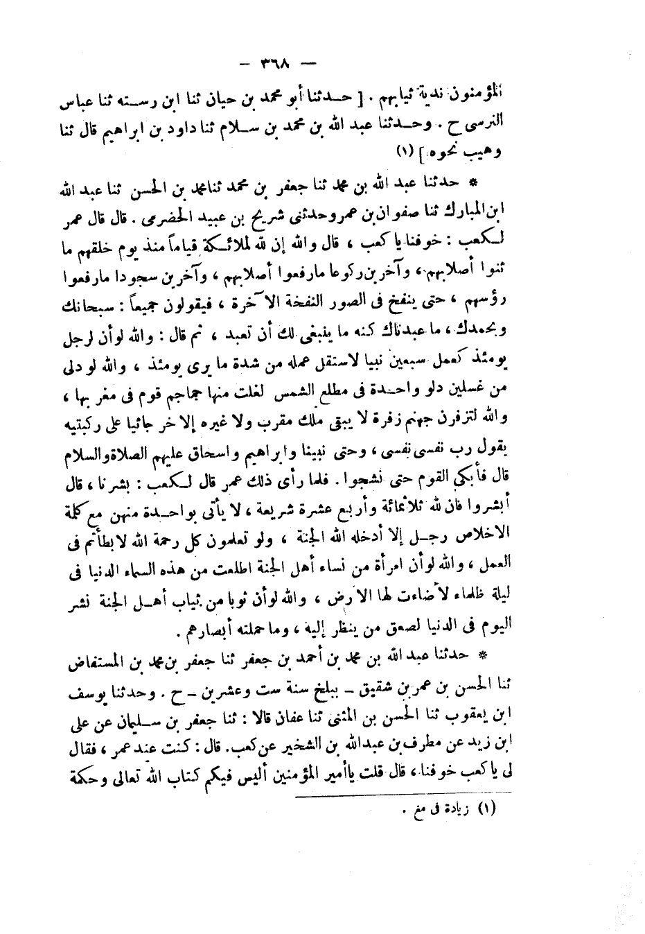حَدَّثَنَا عَبْدُ اللهِ بْنُ مُحَمَّدٍ، ثنا جَعْفَرُ بْنُ مُحَمَّدٍ، ثنا مُحَمَّدُ بْنُ الْحَسَنِ، ثنا عَبْدُ اللهِ بْنُ الْمُبَارَكِ، ثنا صَفْوَانُ بْنُ عَمْرٍو، وَحَدَّثَنِي شُرَيْحُ بْنُ عُبَيْدٍ الْحَضْرَمِيُّ قَالَ: قَالَ عُمَرُ لِكَعْبٍ: خَوِّفْنَا يَا كَعْبُ، قَالَ: " §وَاللهِ إِنَّ لِلَّهِ لَمَلَائِكَةً قِيَامًا مُنْذُ يَوْمِ خَلَقَهُمْ مَا ثَنَوْا أَصْلَابَهُمْ، وَآخَرِينَ رُكُوعًا مَا رَفَعُوا أَصْلَابَهُمْ، وَآخَرِينَ سُجُودًا مَا رَفَعُوا رءُوسَهُمْ، حَتَّى يَنْفُخَ فِي الصُّورِ النَّفْخَةَ الْآخِرَةَ، فَيقُولُونَ جَمِيعًا: سُبْحَانَكَ وَبِحَمْدِكَ، مَا عَبَدْنَاكَ كَمَا يَنْبَغِي لَكَ أَنْ تُعْبَدَ، ثُمَّ قَالَ: وَاللهِ لَوْ أَنَّ لِرَجُلٍ يَوْمَئِذٍ كَعَمَلِ سَبْعِينَ نَبِيًّا لَاسْتَقَلَّ عَمَلَهُ مِنْ شِدَّةِ مَا يَرَى يَوْمَئِذٍ، وَاللهِ لَوْ دُلِّيَ مِنْ غِسْلِينَ دَلْوٌ وَاحِدَةٌ فِي مَطْلِعِ الشَّمْسِ لَغَلَتْ مِنْهَا جَمَاجِمُ قَوْمٍ فِي مَغْرِبِهَا، وَاللهِ لَتَزْفَرَنَّ جَهَنَّمُ زَفْرَةً لَا يَبْقَى مَلَكٌ مُقَرَّبٌ، وَلَا غَيْرُهُ إِلَّا خَرَّ جَاثِيًا عَلَى رُكْبَتَيْهِ، يَقُولُ: رَبِّ نَفْسِي نَفْسِي، وَحَتَّى نَبِيُّنَا وَإِبْرَاهِيمُ وَإِسْحَاقُ عَلَيْهِمُ الصَّلَاةُ وَالسَّلَامُ " قَالَ: فَأَبْكَى الْقَوْمَ حَتَّى نَشَجُوا. فَلَمَّا رَأَى ذَلِكَ عُمَرُ قَالَ لِكَعْبٍ: بَشِّرْنَا فَقَالَ: أَبْشِرُوا، فَإِنَّ لِلَّهِ ثَلَاثَمِائَةٍ وَأَرْبَعَ عَشْرَةَ شَرِيعَةً، لَا يَأْتِي بِوَاحِدَةٍ مِنْهُنَّ مَعَ كَلِمَةِ الْإِخْلَاصِ رَجُلٌ إِلَّا أَدْخَلَهُ اللهُ الْجَنَّةَ، وَلَوْ تَعْلَمُونَ كُلَّ رَحْمَةٍ اللهِ لَأَبْطَأْتُمْ فِي الْعَمَلِ، وَاللهِ لَوْ أَنَّ امْرَأَةً مِنْ نِسَاءِ أَهْلِ الْجَنَّةِ اطَّلَعَتْ مِنْ هَذِهِ السَّمَاءِ الدُّنْيَا فِي لَيْلَةٍ ظَلْمَاءَ لَأَضَاءَتْ لَهَا الْأَرْضُ، وَاللهِ لَوْ أَنَّ ثَوْبًا مِنْ ثِيَابِ أَهْلِ الْجَنَّةِ نُشِرَ الْيوْمَ فِي الدُّنْيَا لَصَعِقَ مَنْ يَنْظُرُ إِلَيْهِ وَمَا حَمَلَتْهُ أَبْصَارُهُمْ "