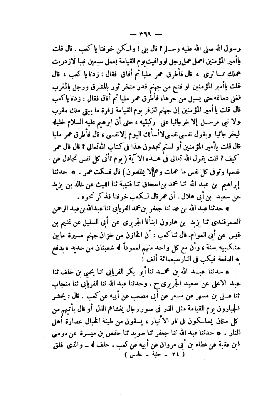 حَدَّثَنَا عَبْدُ اللهِ بْنُ مُحَمَّدٍ، ثنا جَعْفَرُ بْنُ مُحَمَّدٍ الْفِرْيَابِيُّ، ثنا عَبْدُ اللهِ بْنُ عَبْدِ الرَّحْمَنِ السَّمَرْقَنْدِيُّ، ثنا يَزِيدُ بْنُ هَارُونَ، أَنْبَأَنَا الْجُرَيْرِيُّ، عَنْ أَبِي السَّلِيلٍ، عَنْ غُنَيْمِ بْنِ قَيْسٍ، عَنْ أَبِي الْعَوَّامِ قَالَ: ثنا كَعْبٌ «أَنَّ §الْخَازِنَ مِنْ خُزَّانِ جَهَنَّمَ مَسِيرَةُ مَا بَيْنَ مَنْكِبَيْهِ سَنَةٌ، وَأَنَّ مَعَ كُلِّ وَاحِدٍ مِنْهُمْ لَعَمُودًا لَهُ شُعْبَتَانِ مِنْ حَدِيدٍ يَدْفَعُ بِهَا الدَّفْعَةَ فَيُكِبُّ فِي النَّارِ سَبْعَمِائَةِ أَلْفٍ»