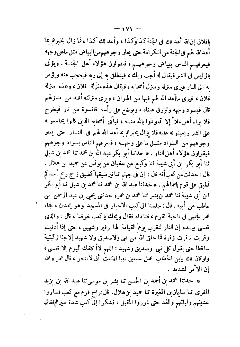 حَدَّثَنَا أَبُو بَكْرٍ عَبْدُ اللهِ بْنِ مُحَمَّدٍ، ثنا مُحَمَّدُ بْنُ شِبْلٍ، ثنا أَبُو بَكْرِ بْنُ أَبِي شَيْبَةَ، ثنا وَكِيعٌ، عَنْ سُفْيَانَ، عَنْ يُونُسَ، عَنْ حُمَيْدِ بْنِ هِلَالٍ قَالَ: حُدِّثْتُ عَنْ كَعْبٍ، أَنَّهُ قَالَ: «§إِنَّ فِي جَهَنَّمَ تَنَانِيرَ ضِيقُهَا كَضِيقِ زُجِّ رُمْحِ أَحَدِكُمْ، تَطْبِقُ عَلَى قَوْمٍ بِأَعْمَالِهِمْ»