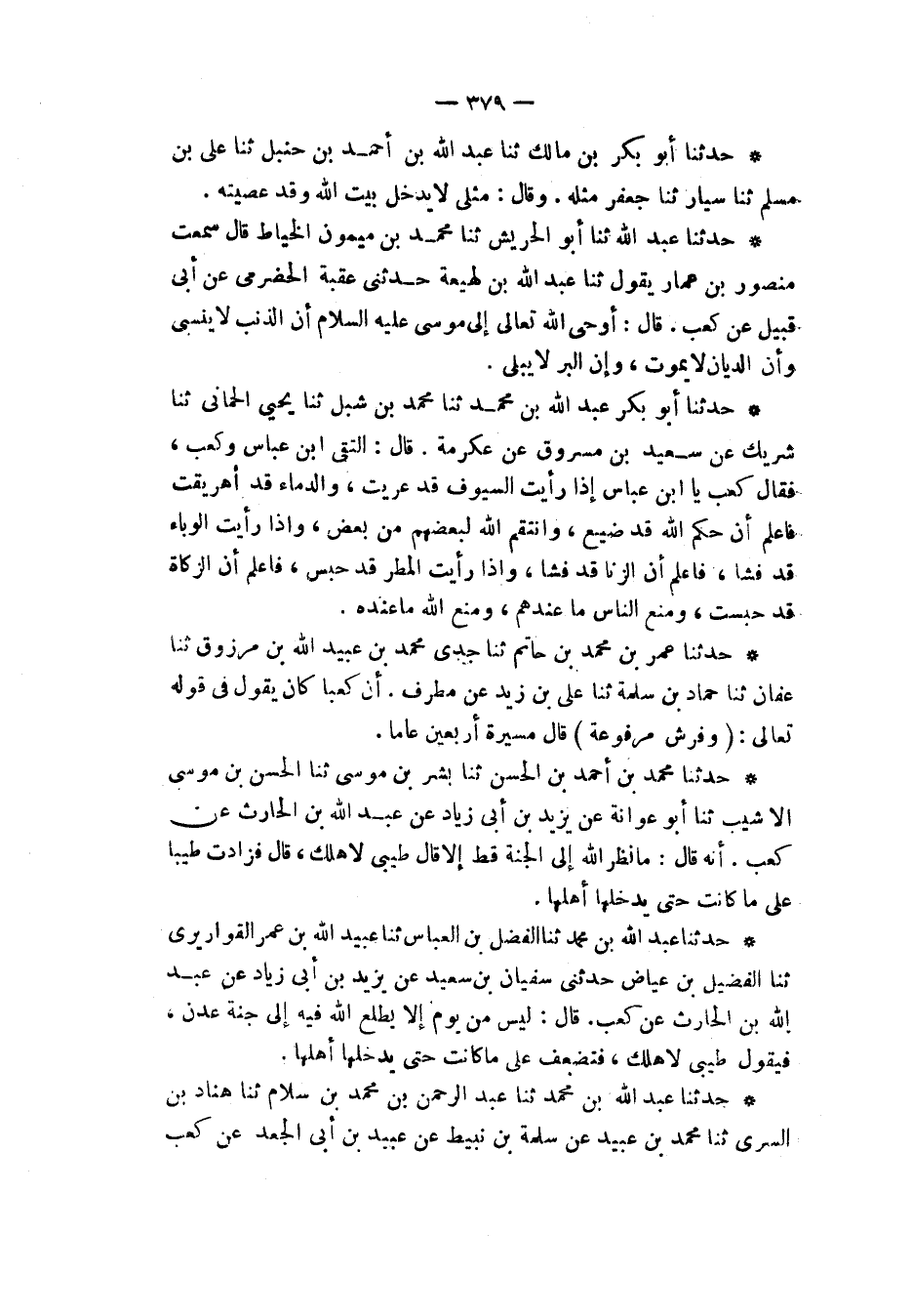 حَدَّثَنَا أَبُو بَكْرٍ عَبْدُ اللهِ بْنِ مُحَمَّدٍ، ثنا مُحَمَّدُ بْنُ شِبْلٍ، ثنا يَحْيَى الْحِمَّانِيُّ، ثنا شَرِيكٌ، عَنْ سَعِيدِ بْنِ مَسْرُوقٍ، عَنْ عِكْرِمَةَ قَالَ: الْتَقَى ابْنُ عَبَّاسٍ وَكَعْبٌ، فَقَالَ كَعْبٌ: «يَا ابْنَ عَبَّاسٍ، §إِذَا رَأَيْتَ السُّيوفَ قَدْ عَرِيَتْ، وَالدِّمَاءَ قَدْ أُهْرِيقَتْ، فَاعْلَمْ أَنَّ حُكْمَ اللهِ قَدْ ضُيِّعَ، وَانْتَقَمَ اللهُ لِبَعْضِهِمْ مِنْ بَعْضٍ، وَإِذَا رَأَيْتَ الْوَبَاءَ قَدْ فَشَا فَاعْلَمْ أَنَّ الزِّنَا قَدْ فَشَا، وَإِذَا رَأَيْتَ الْمَطَرَ قَدْ حُبِسَ فَاعْلَمْ أَنَّ الزَّكَاةَ قَدْ حُبِسَتْ، وَمَنَعَ النَّاسُ مَا عِنْدَهُمْ، وَمَنَعَ اللهُ مَا عِنْدَهُ»