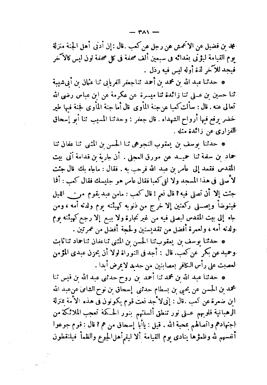 حَدَّثَنَا عَبْدُ اللهِ بْنُ مُحَمَّدِ بْنِ أَحْمَدَ، ثنا جَعْفَرٌ الْفِرْيَابِيُّ، ثنا عُثْمَانُ بْنُ أَبِي شَيْبَةَ، ثنا حُسَيْنُ بْنُ عَلِيٍّ، ثنا زَائِدَةُ، ثنا مَيْسَرَةُ، عَنْ عِكْرِمَةَ، عَنِ ابْنِ عَبَّاسٍ رِضَيَ اللهُ تَعَالَى عَنْهُ قَالَ: سَأَلْتُ كَعْبًا عَنْ جَنَّةِ الْمَأْوَى قَالَ: «§أَمَّا جَنَّةُ الْمَأْوَى فَجَنَّةٌ فِيهَا طَيْرٌ خُضْرٌ، يُرْفَعُ فِيهَا أَرْوَاحُ الشُّهَدَاءِ» قَالَ جَعْفَرٌ: وَحَدَّثَنَا الْمُسَيَّبُ، ثنا أَبُو إِسْحَاقَ الْفَزَارِيُّ، عَنْ زَائِدَةَ، مِثْلَهُ