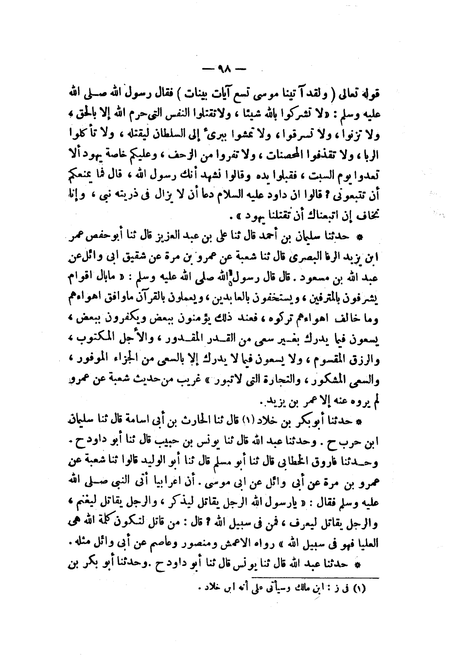 حَدَّثَنَا أَبُو بَكْرِ بْنِ خَلَّادٍ قَالَ: ثنا الْحَارِثُ بْنُ أَبِي أُسَامَةَ قَالَ: ثنا سُلَيْمَانُ بْنُ حَرْبٍ، ح. وَحَدَّثَنَا عَبْدُ اللهِ قَالَ: ثنا يُونُسُ بْنُ حَبِيبٍ قَالَ: ثنا أَبُو دَاوُدَ، ح. وَحَدَّثَنَا فَارُوقٌ الْخَطَّابِيُّ قَالَ: نا أَبُو مُسْلِمٍ نا أَبُو الْوَلِيدِ قَالُوا: ثنا شُعْبَةُ، عَنْ عَمْرِو بْنِ مُرَّةَ، عَنْ أَبِي وَائِلٍ، عَنْ أَبِي مُوسَى، أَنَّ أَعْرَابِيًّا، أَتَى النَّبِيَّ صَلَّى اللهُ عَلَيْهِ وَسَلَّمَ فَقَالَ: يَا رَسُولَ اللهِ، الرَّجُلُ يُقَاتِلُ لِيُذْكَرَ، وَالرَّجُلُ يُقَاتِلُ لِيَغْنَمَ، وَالرَّجُلُ يُقَاتِلُ لِيُعْرَفَ، فَمَنْ فِي سَبِيلِ اللهِ؟ قَالَ: «§مَنْ قَاتَلَ لِتَكُونَ كَلِمَةُ اللهِ هِيَ الْعُلْيَا، فَهُوَ فِي سَبِيلِ اللهِ» رَوَاهُ الْأَعْمَشُ، وَمَنْصُورٌ، وَعَاصِمٌ، عَنْ أَبِي وَائِلٍ مِثْلَهُ