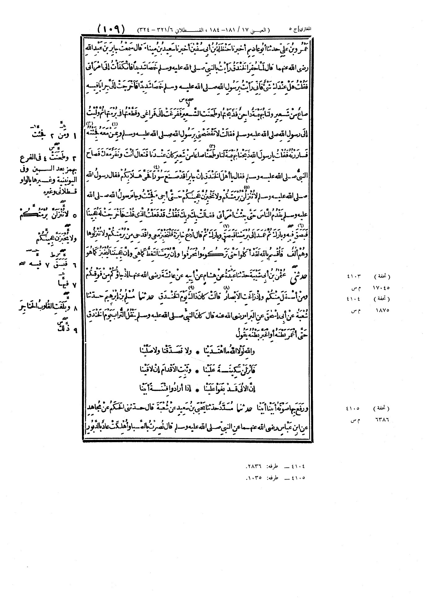 ٤١٠٤ - حَدَّثَنَا مُسْلِمُ بْنُ إِبْرَاهِيمَ، حَدَّثَنَا شُعْبَةُ، عَنْ أَبِي إِسْحَاقَ، عَنِ البَرَاءِ رَضِيَ اللَّهُ عَنْهُ، قَالَ: كَانَ النَّبِيُّ صَلَّى اللهُ عَلَيْهِ وَسَلَّمَ يَنْقُلُ التُّرَابَ يَوْمَ الخَنْدَقِ، حَتَّى أَغْمَرَ بَطْنَهُ، أَوْ اغْبَرَّ بَطْنُهُ، يَقُولُ: «وَاللَّهِ لَوْلَا اللَّهُ مَا اهْتَدَيْنَا، وَلَا تَصَدَّقْنَا وَلَا صَلَّيْنَا، فَأَنْزِلَنْ سَكِينَةً عَلَيْنَا، وَثَبِّتِ الأَقْدَامَ إِنْ لَاقَيْنَا، إِنَّ الأُلَى قَدْ بَغَوْا عَلَيْنَا، إِذَا أَرَادُوا فِتْنَةً أَبَيْنَا» وَرَفَعَ بِهَا صَوْتَهُ: «أَبَيْنَا أَبَيْنَا»