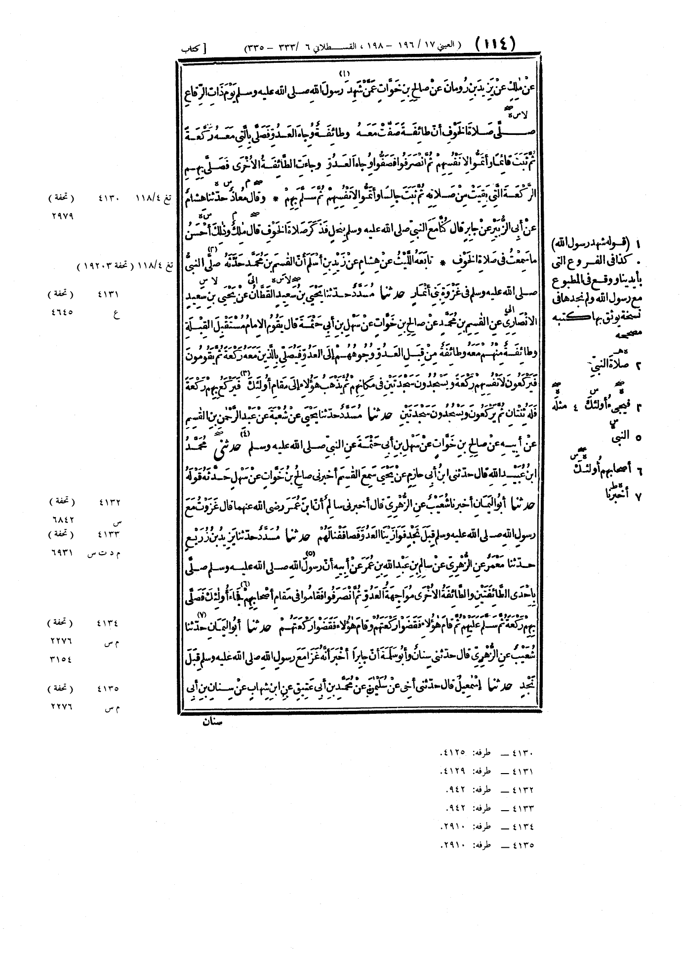 ٤١٣١ - حَدَّثَنَا مُسَدَّدٌ، حَدَّثَنَا يَحْيَى بْنُ سَعِيدٍ القَطَّانُ، عَنْ يَحْيَى بْنِ سَعِيدٍ الأَنْصَارِيِّ، عَنِ القَاسِمِ بْنِ مُحَمَّدٍ، عَنْ صَالِحِ بْنِ خَوَّاتٍ، عَنْ سَهْلِ بْنِ أَبِي حَثْمَةَ، قَالَ: «يَقُومُ الإِمَامُ مُسْتَقْبِلَ القِبْلَةِ، وَطَائِفَةٌ مِنْهُمْ مَعَهُ، وَطَائِفَةٌ مِنْ قِبَلِ العَدُوِّ، وُجُوهُهُمْ إِلَى العَدُوِّ، فَيُصَلِّي بِالَّذِينَ مَعَهُ رَكْعَةً، ثُمَّ يَقُومُونَ فَيَرْكَعُونَ لِأَنْفُسِهِمْ رَكْعَةً، وَيَسْجُدُونَ سَجْدَتَيْنِ فِي مَكَانِهِمْ، ثُمَّ يَذْهَبُ هَؤُلَاءِ إِلَى مَقَامِ أُولَئِكَ، فَيَرْكَعُ بِهِمْ رَكْعَةً، فَلَهُ ثِنْتَانِ، ثُمَّ يَرْكَعُونَ وَيَسْجُدُونَ سَجْدَتَيْنِ» حَدَّثَنَا مُسَدَّدٌ، حَدَّثَنَا يَحْيَى، عَنْ شُعْبَةَ، عَنْ عَبْدِ الرَّحْمَنِ بْنِ القَاسِمِ، عَنْ أَبِيهِ، عَنْ صَالِحِ بْنِ خَوَّاتٍ، عَنْ سَهْلِ بْنِ أَبِي حَثْمَةَ، عَنِ النَّبِيِّ صَلَّى اللهُ عَلَيْهِ وَسَلَّمَ: مِثْلَهُ، حَدَّثَنِي مُحَمَّدُ بْنُ عُبَيْدِ اللَّهِ، قَالَ: حَدَّثَنِي ابْنُ أَبِي حَازِمٍ، عَنْ يَحْيَى، سَمِعَ القَاسِمَ، أَخْبَرَنِي صَالِحُ بْنُ خَوَّاتٍ، عَنْ سَهْلٍ: حَدَّثَهُ: قَوْلَهُ، تَابَعَهُ اللَّيْثُ، عَنْ هِشَامٍ، عَنْ زَيْدِ بْنِ أَسْلَمَ، أَنَّ القَاسِمَ بْنَ مُحَمَّدٍ، حَدَّثَهُ: صَلَّى النَّبِيُّ صَلَّى اللهُ عَلَيْهِ وَسَلَّمَ فِي غَزْوَةِ بَنِي أَنْمَارٍ