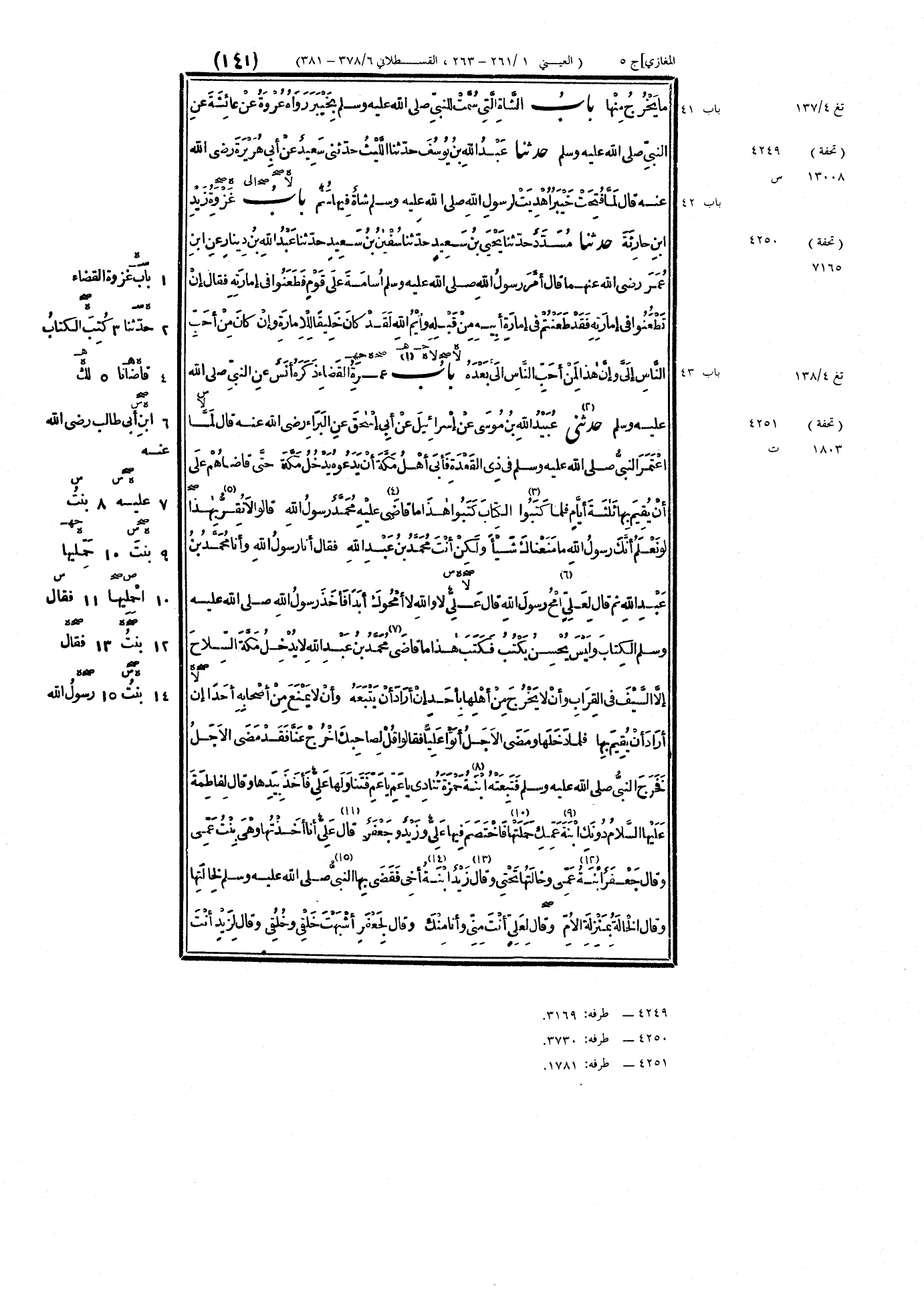 ٤٢٥١ - حَدَّثَنِي عُبَيْدُ اللَّهِ بْنُ مُوسَى، عَنْ إِسْرَائِيلَ، عَنْ أَبِي إِسْحَاقَ، عَنِ البَرَاءِ رَضِيَ اللَّهُ عَنْهُ، قَالَ: لَمَّا اعْتَمَرَ النَّبِيُّ صَلَّى اللهُ عَلَيْهِ وَسَلَّمَ فِي ذِي القَعْدَةِ، فَأَبَى أَهْلُ مَكَّةَ أَنْ يَدَعُوهُ يَدْخُلُ مَكَّةَ، حَتَّى قَاضَاهُمْ عَلَى أَنْ يُقِيمَ بِهَا ثَلَاثَةَ أَيَّامٍ، فَلَمَّا كَتَبُوا الكِتَابَ، كَتَبُوا: هَذَا مَا قَاضَى عَلَيْهِ مُحَمَّدٌ رَسُولُ اللَّهِ، قَالُوا: لَا نُقِرُّ لَكَ بِهَذَا، لَوْ نَعْلَمُ أَنَّكَ رَسُولُ اللَّهِ مَا مَنَعْنَاكَ شَيْئًا، وَلَكِنْ أَنْتَ مُحَمَّدُ بْنُ عَبْدِ اللَّهِ، فَقَالَ «أَنَا رَسُولُ اللَّهِ، وَأَنَا مُحَمَّدُ بْنُ عَبْدِ اللَّهِ»، ثُمَّ قَالَ: لِعَلِيِّ بْنِ أَبِي طَالِبٍ رَضِيَ اللَّهُ عَنْهُ: «امْحُ رَسُولَ اللَّهِ»، قَالَ عَلِيٌّ: لَا وَاللَّهِ لَا أَمْحُوكَ أَبَدًا، فَأَخَذَ رَسُولُ اللَّهِ صَلَّى اللهُ عَلَيْهِ وَسَلَّمَ الكِتَابَ، وَلَيْسَ يُحْسِنُ يَكْتُبُ، فَكَتَبَ: هَذَا مَا قَاضَى عَلَيْهِ مُحَمَّدُ بْنُ عَبْدِ اللَّهِ، لَا يُدْخِلُ مَكَّةَ السِّلَاحَ إِلَّا السَّيْفَ فِي القِرَابِ، وَأَنْ لَا يَخْرُجَ مِنْ أَهْلِهَا بِأَحَدٍ إِنْ أَرَادَ أَنْ يَتْبَعَهُ، وَأَنْ لَا يَمْنَعَ مِنْ أَصْحَابِهِ أَحَدًا، إِنْ أَرَادَ أَنْ يُقِيمَ بِهَا. فَلَمَّا دَخَلَهَا وَمَضَى الأَجَلُ أَتَوْا عَلِيًّا، فَقَالُوا: قُلْ لِصَاحِبِكَ: اخْرُجْ عَنَّا، فَقَدْ مَضَى الأَجَلُ، فَخَرَجَ النَّبِيُّ صَلَّى اللهُ عَلَيْهِ وَسَلَّمَ، فَتَبِعَتْهُ ابْنَةُ حَمْزَةَ، تُنَادِي يَا عَمِّ يَا عَمِّ، فَتَنَاوَلَهَا عَلِيٌّ فَأَخَذَ بِيَدِهَا، وَقَالَ لِفَاطِمَةَ عَلَيْهَا السَّلَامُ: دُونَكِ ابْنَةَ عَمِّكِ حَمَلَتْهَا، فَاخْتَصَمَ فِيهَا عَلِيٌّ وَزَيْدٌ وَجَعْفَرٌ، قَالَ عَلِيٌّ: أَنَا أَخَذْتُهَا، وَهِيَ بِنْتُ عَمِّي، وَقَالَ جَعْفَرٌ: ابْنَةُ عَمِّي وَخَالَتُهَا تَحْتِي، وَقَالَ زَيْدٌ: ابْنَةُ أَخِي. فَقَضَى بِهَا النَّبِيُّ صَلَّى اللهُ عَلَيْهِ وَسَلَّمَ لِخَالَتِهَا، وَقَالَ: «الخَالَةُ بِمَنْزِلَةِ الأُمِّ» وَقَالَ لِعَلِيٍّ: «أَنْتَ مِنِّي وَأَنَا مِنْكَ» وَقَالَ لِجَعْفَرٍ: «أَشْبَهْتَ خَلْقِي وَخُلُقِي»، وَقَالَ لِزَيْدٍ: «أَنْتَ ⦗١٤٢⦘ أَخُونَا وَمَوْلَانَا»، وَقَالَ عَلِيٌّ: أَلَا تَتَزَوَّجُ بِنْتَ حَمْزَةَ؟ قَالَ: «إِنَّهَا ابْنَةُ أَخِي مِنَ الرَّضَاعَةِ»