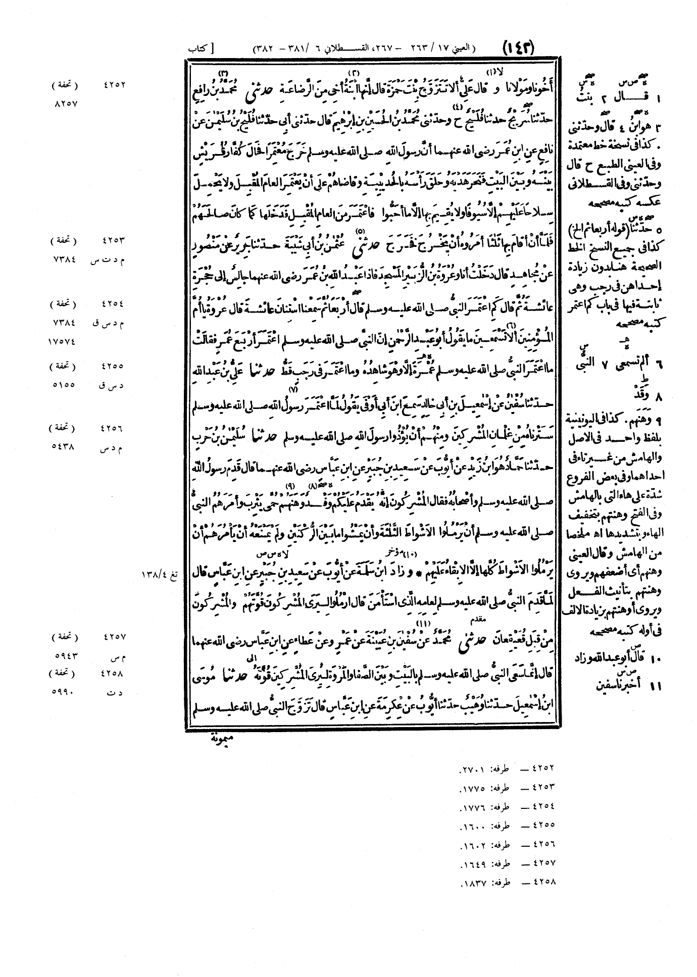 ٤٢٥٣ - حَدَّثَنِي عُثْمَانُ بْنُ أَبِي شَيْبَةَ، حَدَّثَنَا جَرِيرٌ، عَنْ مَنْصُورٍ، عَنْ مُجَاهِدٍ، قَالَ: دَخَلْتُ أَنَا وَعُرْوَةُ بْنُ الزُّبَيْرِ المَسْجِدَ، فَإِذَا عَبْدُ اللَّهِ بْنُ عُمَرَ رَضِيَ اللَّهُ عَنْهُمَا، جَالِسٌ إِلَى حُجْرَةِ عَائِشَةَ ثُمَّ قَالَ: «كَمُ اعْتَمَرَ النَّبِيُّ صَلَّى اللهُ عَلَيْهِ وَسَلَّمَ؟» قَالَ: أَرْبَعًا،