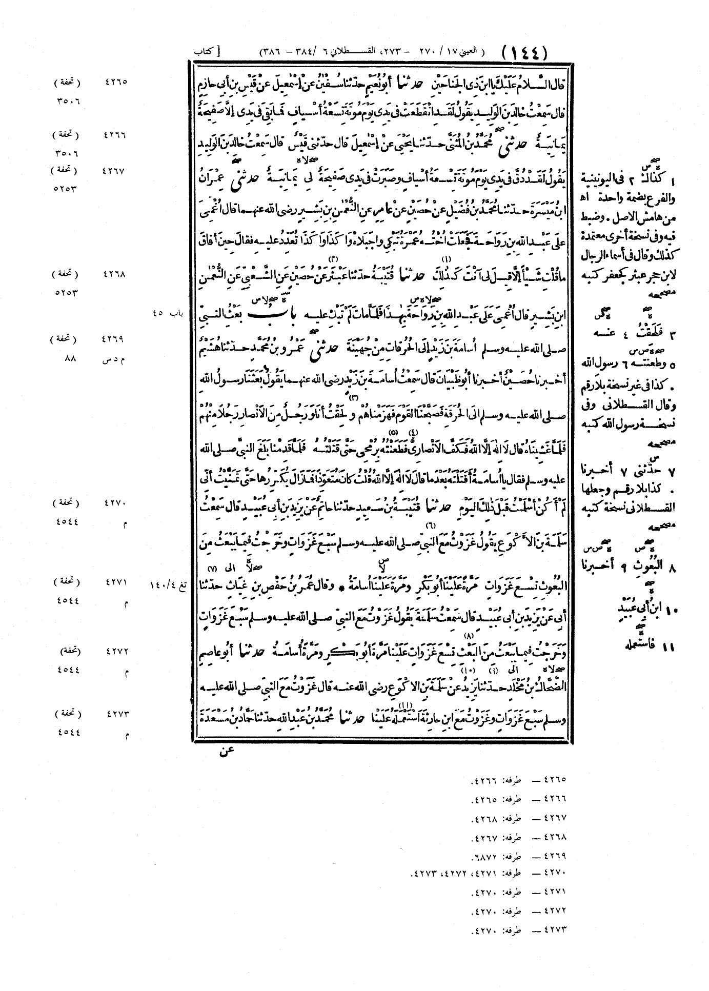 ٤٢٧٠ - حَدَّثَنَا قُتَيْبَةُ بْنُ سَعِيدٍ، حَدَّثَنَا حَاتِمٌ، عَنْ يَزِيدَ بْنِ أَبِي عُبَيْدٍ، قَالَ: سَمِعْتُ سَلَمَةَ بْنَ الأَكْوَعِ، يَقُولُ: «غَزَوْتُ مَعَ النَّبِيِّ صَلَّى اللهُ عَلَيْهِ وَسَلَّمَ سَبْعَ غَزَوَاتٍ، وَخَرَجْتُ فِيمَا يَبْعَثُ مِنَ البُعُوثِ تِسْعَ غَزَوَاتٍ مَرَّةً عَلَيْنَا أَبُو بَكْرٍ، وَمَرَّةً عَلَيْنَا أُسَامَةُ»