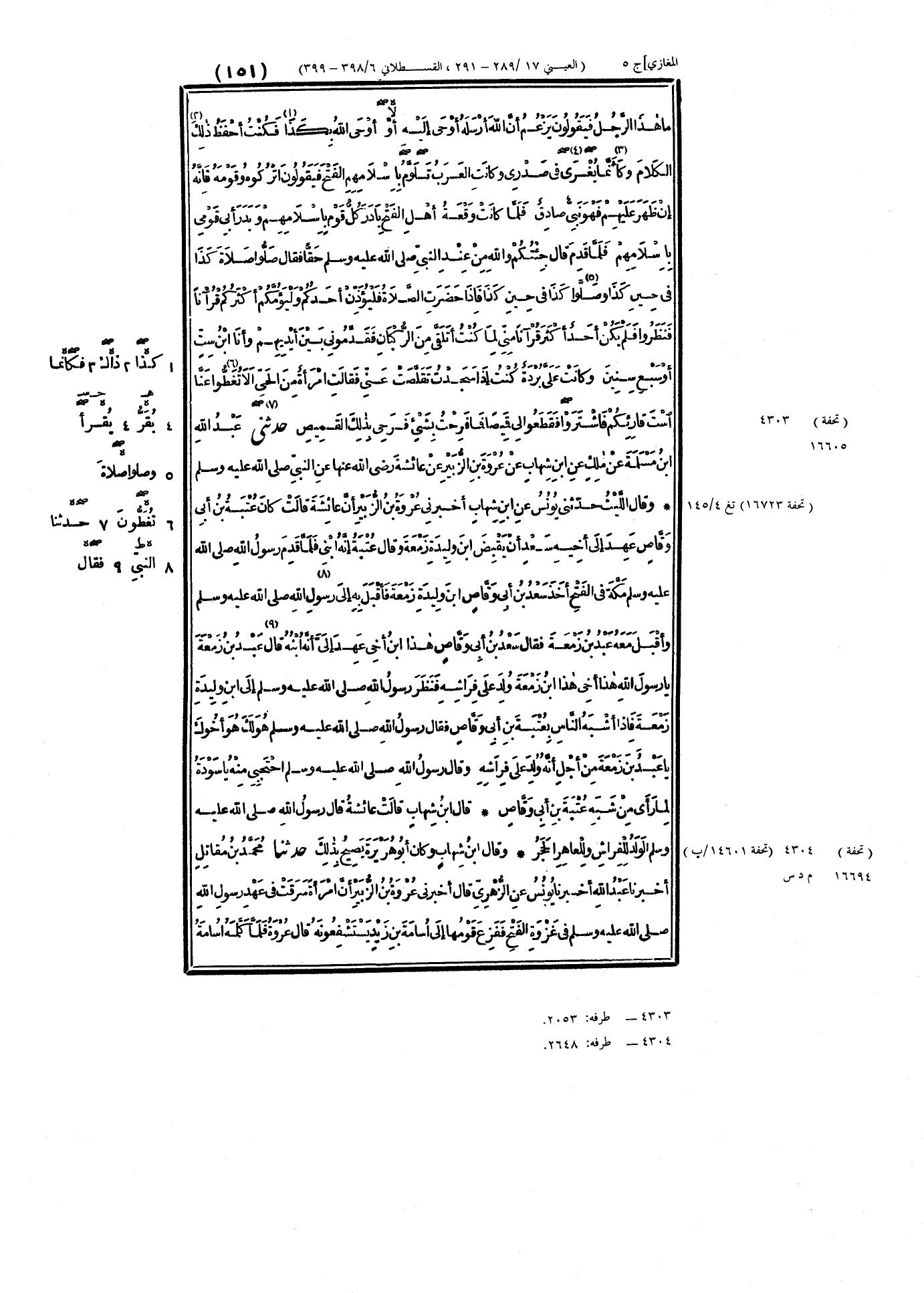 ٤٣٠٣ - حَدَّثَنِي عَبْدُ اللَّهِ بْنُ مَسْلَمَةَ، عَنْ مَالِكٍ، عَنِ ابْنِ شِهَابٍ، عَنْ عُرْوَةَ بْنِ الزُّبَيْرِ، عَنْ عَائِشَةَ رَضِيَ اللَّهُ عَنْهَا، عَنِ النَّبِيِّ صَلَّى اللهُ عَلَيْهِ وَسَلَّمَ وَقَالَ اللَّيْثُ: حَدَّثَنِي يُونُسُ، عَنْ ابْنِ شِهَابٍ، أَخْبَرَنِي عُرْوَةُ بْنُ الزُّبَيْرِ، أَنَّ عَائِشَةَ قَالَتْ: كَانَ عُتْبَةُ بْنُ أَبِي وَقَّاصٍ عَهِدَ إِلَى أَخِيهِ سَعْدٍ: أَنْ يَقْبِضَ ابْنَ وَلِيدَةِ زَمْعَةَ، وَقَالَ عُتْبَةُ: إِنَّهُ ابْنِي، فَلَمَّا قَدِمَ رَسُولُ اللَّهِ صَلَّى اللهُ عَلَيْهِ وَسَلَّمَ مَكَّةَ فِي الفَتْحِ، أَخَذَ سَعْدُ بْنُ أَبِي وَقَّاصٍ ابْنَ وَلِيدَةِ زَمْعَةَ، فَأَقْبَلَ بِهِ إِلَى رَسُولِ اللَّهِ صَلَّى اللهُ عَلَيْهِ وَسَلَّمَ، وَأَقْبَلَ مَعَهُ عَبْدُ بْنُ زَمْعَةَ، فَقَالَ سَعْدُ بْنُ أَبِي وَقَّاصٍ: هَذَا ابْنُ أَخِي عَهِدَ إِلَيَّ أَنَّهُ ابْنُهُ، قَالَ عَبْدُ بْنُ زَمْعَةَ: يَا رَسُولَ اللَّهِ هَذَا أَخِي هَذَا ابْنُ زَمْعَةَ وُلِدَ عَلَى فِرَاشِهِ، فَنَظَرَ رَسُولُ اللَّهِ صَلَّى اللهُ عَلَيْهِ وَسَلَّمَ إِلَى ابْنِ وَلِيدَةِ زَمْعَةَ، فَإِذَا أَشْبَهُ النَّاسِ بِعُتْبَةَ بْنِ أَبِي وَقَّاصٍ فَقَالَ رَسُولُ اللَّهِ صَلَّى اللهُ عَلَيْهِ وَسَلَّمَ: «هُوَ لَكَ هُوَ أَخُوكَ يَا عَبْدُ بْنَ زَمْعَةَ» مِنْ أَجْلِ أَنَّهُ وُلِدَ عَلَى فِرَاشِهِ، وَقَالَ رَسُولُ اللَّهِ صَلَّى اللهُ عَلَيْهِ وَسَلَّمَ: «احْتَجِبِي مِنْهُ يَا سَوْدَةُ» لِمَا رَأَى مِنْ شَبَهِ عُتْبَةَ بْنِ أَبِي وَقَّاصٍ قَالَ ابْنُ شِهَابٍ: قَالَتْ عَائِشَةُ: قَالَ رَسُولُ اللَّهِ صَلَّى اللهُ عَلَيْهِ وَسَلَّمَ: «الوَلَدُ لِلْفِرَاشِ وَلِلْعَاهِرِ الحَجَرُ» وَقَالَ ابْنُ شِهَابٍ: وَكَانَ أَبُو هُرَيْرَةَ يَصِيحُ بِذَلِكَ