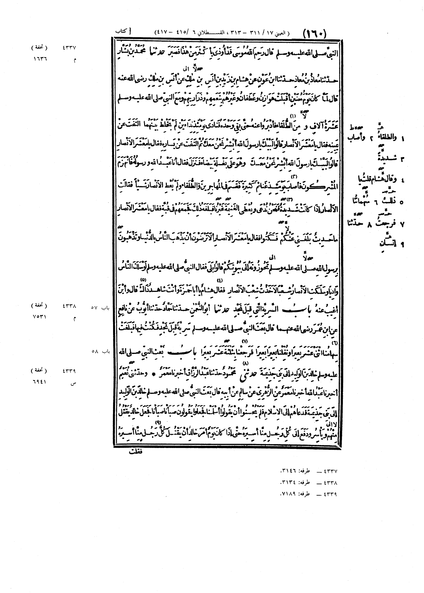 ٤٣٣٧ - حَدَّثَنَا مُحَمَّدُ بْنُ بَشَّارٍ، حَدَّثَنَا مُعَاذُ بْنُ مُعَاذٍ، حَدَّثَنَا ابْنُ عَوْنٍ، عَنْ هِشَامِ بْنِ زَيْدِ بْنِ أَنَسِ بْنِ مَالِكٍ، عَنْ أَنَسِ بْنِ مَالِكٍ رَضِيَ اللَّهُ عَنْهُ، قَالَ: لَمَّا كَانَ يَوْمَ حُنَيْنٍ، أَقْبَلَتْ هَوَازِنُ وَغَطَفَانُ وَغَيْرُهُمْ بِنَعَمِهِمْ وَذَرَارِيِّهِمْ، وَمَعَ النَّبِيِّ صَلَّى اللهُ عَلَيْهِ وَسَلَّمَ عَشَرَةُ آلَافٍ، وَمِنَ الطُّلَقَاءِ، فَأَدْبَرُوا عَنْهُ حَتَّى بَقِيَ وَحْدَهُ، فَنَادَى يَوْمَئِذٍ نِدَاءَيْنِ لَمْ يَخْلِطْ بَيْنَهُمَا، التَفَتَ عَنْ يَمِينِهِ فَقَالَ: «يَا مَعْشَرَ الأَنْصَارِ». قَالُوا: لَبَّيْكَ يَا رَسُولَ اللَّهِ أَبْشِرْ نَحْنُ مَعَكَ، ثُمَّ التَفَتَ عَنْ يَسَارِهِ فَقَالَ: «يَا مَعْشَرَ الأَنْصَارِ» قَالُوا: لَبَّيْكَ يَا رَسُولَ اللَّهِ أَبْشِرْ نَحْنُ مَعَكَ، وَهُوَ عَلَى بَغْلَةٍ بَيْضَاءَ فَنَزَلَ فَقَالَ: «أَنَا عَبْدُ اللَّهِ وَرَسُولُهُ». فَانْهَزَمَ المُشْرِكُونَ، فَأَصَابَ يَوْمَئِذٍ غَنَائِمَ كَثِيرَةً، فَقَسَمَ فِي المُهَاجِرِينَ وَالطُّلَقَاءِ وَلَمْ يُعْطِ الأَنْصَارَ شَيْئًا، فَقَالَتِ الأَنْصَارُ: إِذَا كَانَتْ شَدِيدَةٌ فَنَحْنُ نُدْعَى، وَيُعْطَى الغَنِيمَةَ غَيْرُنَا، فَبَلَغَهُ ذَلِكَ فَجَمَعَهُمْ فِي قُبَّةٍ، فَقَالَ: «يَا مَعْشَرَ الأَنْصَارِ، مَا حَدِيثٌ بَلَغَنِي عَنْكُمْ» فَسَكَتُوا، فَقَالَ: «يَا مَعْشَرَ الأَنْصَارِ، أَلَا تَرْضَوْنَ أَنْ يَذْهَبَ النَّاسُ بِالدُّنْيَا، وَتَذْهَبُونَ بِرَسُولِ اللَّهِ تَحُوزُونَهُ إِلَى بُيُوتِكُمْ» قَالُوا: بَلَى، فَقَالَ النَّبِيُّ صَلَّى اللهُ عَلَيْهِ وَسَلَّمَ: «لَوْ سَلَكَ النَّاسُ وَادِيًا، وَسَلَكَتِ الأَنْصَارُ شِعْبًا، لَأَخَذْتُ شِعْبَ الأَنْصَارِ» وَقَالَ هِشَامٌ: قُلْتُ: يَا أَبَا حَمْزَةَ وَأَنْتَ شَاهِدٌ ذَاكَ قَالَ: «وَأَيْنَ أَغِيبُ عَنْهُ»