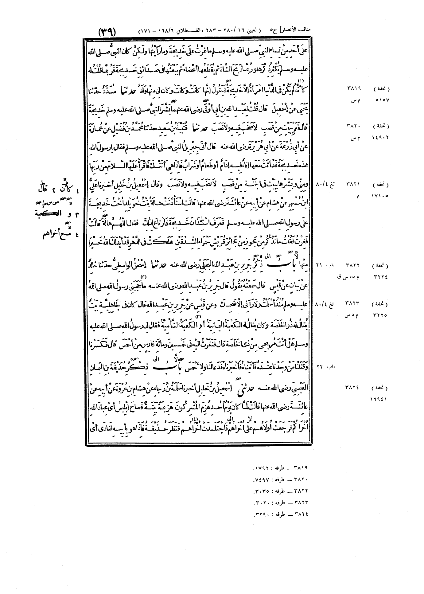 ٣٨٢١ - وَقَالَ إِسْمَاعِيلُ بْنُ خَلِيلٍ: أَخْبَرَنَا عَلِيُّ بْنُ مُسْهِرٍ، عَنْ هِشَامٍ، عَنْ أَبِيهِ، عَنْ عَائِشَةَ رَضِيَ اللَّهُ عَنْهَا، قَالَتْ: اسْتَأْذَنَتْ هَالَةُ بِنْتُ خُوَيْلِدٍ، أُخْتُ خَدِيجَةَ، عَلَى رَسُولِ اللَّهِ صَلَّى اللهُ عَلَيْهِ وَسَلَّمَ، فَعَرَفَ اسْتِئْذَانَ خَدِيجَةَ فَارْتَاعَ لِذَلِكَ، فَقَالَ: «اللَّهُمَّ هَالَةَ». قَالَتْ: فَغِرْتُ، فَقُلْتُ: مَا تَذْكُرُ مِنْ عَجُوزٍ مِنْ عَجَائِزِ قُرَيْشٍ، حَمْرَاءِ الشِّدْقَيْنِ، هَلَكَتْ فِي الدَّهْرِ، قَدْ أَبْدَلَكَ اللَّهُ خَيْرًا مِنْهَا "