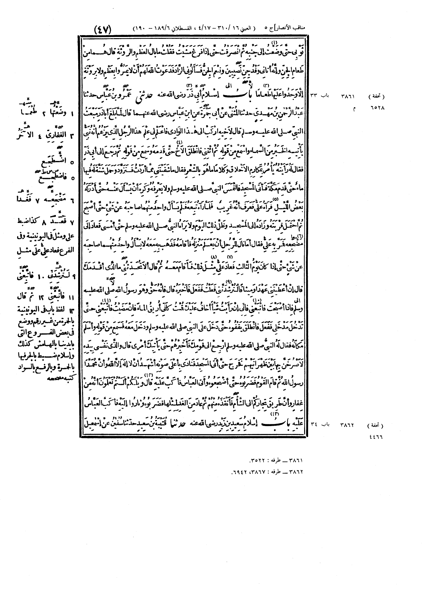 ٣٨٦١ - حَدَّثَنِي عَمْرُو بْنُ عَبَّاسٍ، حَدَّثَنَا عَبْدُ الرَّحْمَنِ بْنُ مَهْدِيٍّ، حَدَّثَنَا المُثَنَّى، عَنْ أَبِي جَمْرَةَ، عَنِ ابْنِ عَبَّاسٍ رَضِيَ اللَّهُ عَنْهُمَا، قَالَ: لَمَّا بَلَغَ أَبَا ذَرٍّ مَبْعَثُ النَّبِيِّ صَلَّى اللهُ عَلَيْهِ وَسَلَّمَ، قَالَ لِأَخِيهِ: ارْكَبْ إِلَى هَذَا الوَادِي فَاعْلَمْ لِي عِلْمَ هَذَا الرَّجُلِ الَّذِي يَزْعُمُ أَنَّهُ نَبِيٌّ، يَأْتِيهِ الخَبَرُ مِنَ السَّمَاءِ، وَاسْمَعْ مِنْ قَوْلِهِ ثُمَّ ائْتِنِي، فَانْطَلَقَ الأَخُ حَتَّى قَدِمَهُ، وَسَمِعَ مِنْ قَوْلِهِ، ثُمَّ رَجَعَ إِلَى أَبِي ذَرٍّ فَقَالَ لَهُ: رَأَيْتُهُ يَأْمُرُ بِمَكَارِمِ الأَخْلَاقِ، وَكَلَامًا مَا هُوَ بِالشِّعْرِ، فَقَالَ: مَا شَفَيْتَنِي مِمَّا أَرَدْتُ، فَتَزَوَّدَ وَحَمَلَ شَنَّةً لَهُ فِيهَا مَاءٌ، حَتَّى قَدِمَ مَكَّةَ، فَأَتَى المَسْجِدَ فَالْتَمَسَ النَّبِيَّ صَلَّى اللهُ عَلَيْهِ وَسَلَّمَ وَلَا يَعْرِفُهُ، وَكَرِهَ أَنْ يَسْأَلَ عَنْهُ حَتَّى أَدْرَكَهُ بَعْضُ اللَّيْلِ، فَاضْطَجَعَ فَرَآهُ عَلِيٌّ فَعَرَفَ أَنَّهُ غَرِيبٌ، فَلَمَّا رَآهُ تَبِعَهُ فَلَمْ يَسْأَلْ وَاحِدٌ مِنْهُمَا صَاحِبَهُ عَنْ شَيْءٍ حَتَّى أَصْبَحَ، ثُمَّ احْتَمَلَ قِرْبَتَهُ وَزَادَهُ إِلَى المَسْجِدِ، وَظَلَّ ذَلِكَ اليَوْمَ وَلَا يَرَاهُ النَّبِيُّ صَلَّى اللهُ عَلَيْهِ وَسَلَّمَ حَتَّى أَمْسَى، فَعَادَ إِلَى مَضْجَعِهِ، فَمَرَّ بِهِ عَلِيٌّ فَقَالَ: أَمَا نَالَ لِلرَّجُلِ أَنْ يَعْلَمَ مَنْزِلَهُ؟ فَأَقَامَهُ فَذَهَبَ بِهِ مَعَهُ، لَا يَسْأَلُ وَاحِدٌ مِنْهُمَا صَاحِبَهُ عَنْ شَيْءٍ، حَتَّى إِذَا كَانَ يَوْمُ الثَّالِثِ، فَعَادَ عَلِيٌّ عَلَى مِثْلِ ذَلِكَ، فَأَقَامَ مَعَهُ ثُمَّ قَالَ: أَلَا تُحَدِّثُنِي مَا الَّذِي أَقْدَمَكَ؟ قَالَ: إِنْ أَعْطَيْتَنِي عَهْدًا وَمِيثَاقًا لَتُرْشِدَنِّي فَعَلْتُ، فَفَعَلَ فَأَخْبَرَهُ، قَالَ: فَإِنَّهُ حَقٌّ، وَهُوَ رَسُولُ اللَّهِ صَلَّى اللهُ عَلَيْهِ وَسَلَّمَ، فَإِذَا أَصْبَحْتَ فَاتْبَعْنِي، فَإِنِّي إِنْ رَأَيْتُ شَيْئًا أَخَافُ عَلَيْكَ قُمْتُ كَأَنِّي أُرِيقُ المَاءَ، فَإِنْ مَضَيْتُ فَاتْبَعْنِي حَتَّى تَدْخُلَ مَدْخَلِي فَفَعَلَ، فَانْطَلَقَ يَقْفُوهُ حَتَّى دَخَلَ عَلَى النَّبِيِّ صَلَّى اللهُ عَلَيْهِ وَسَلَّمَ، وَدَخَلَ مَعَهُ، فَسَمِعَ مِنْ قَوْلِهِ وَأَسْلَمَ مَكَانَهُ، فَقَالَ لَهُ النَّبِيُّ صَلَّى اللهُ عَلَيْهِ وَسَلَّمَ: «ارْجِعْ إِلَى قَوْمِكَ فَأَخْبِرْهُمْ حَتَّى يَأْتِيَكَ أَمْرِي» قَالَ: وَالَّذِي نَفْسِي بِيَدِهِ، لَأَصْرُخَنَّ بِهَا بَيْنَ ظَهْرَانَيْهِمْ، فَخَرَجَ حَتَّى أَتَى المَسْجِدَ، فَنَادَى بِأَعْلَى صَوْتِهِ: أَشْهَدُ أَنْ لَا إِلَهَ إِلَّا اللَّهُ، وَأَنَّ مُحَمَّدًا رَسُولُ اللَّهِ، ثُمَّ قَامَ القَوْمُ فَضَرَبُوهُ حَتَّى أَضْجَعُوهُ، وَأَتَى العَبَّاسُ فَأَكَبَّ عَلَيْهِ، قَالَ: وَيْلَكُمْ أَلَسْتُمْ تَعْلَمُونَ أَنَّهُ مِنْ غِفَارٍ، وَأَنَّ طَرِيقَ تِجَارِكُمْ إِلَى الشَّأْمِ، فَأَنْقَذَهُ مِنْهُمْ، ثُمَّ عَادَ مِنَ الغَدِ لِمِثْلِهَا، فَضَرَبُوهُ وَثَارُوا إِلَيْهِ، فَأَكَبَّ العَبَّاسُ عَلَيْهِ