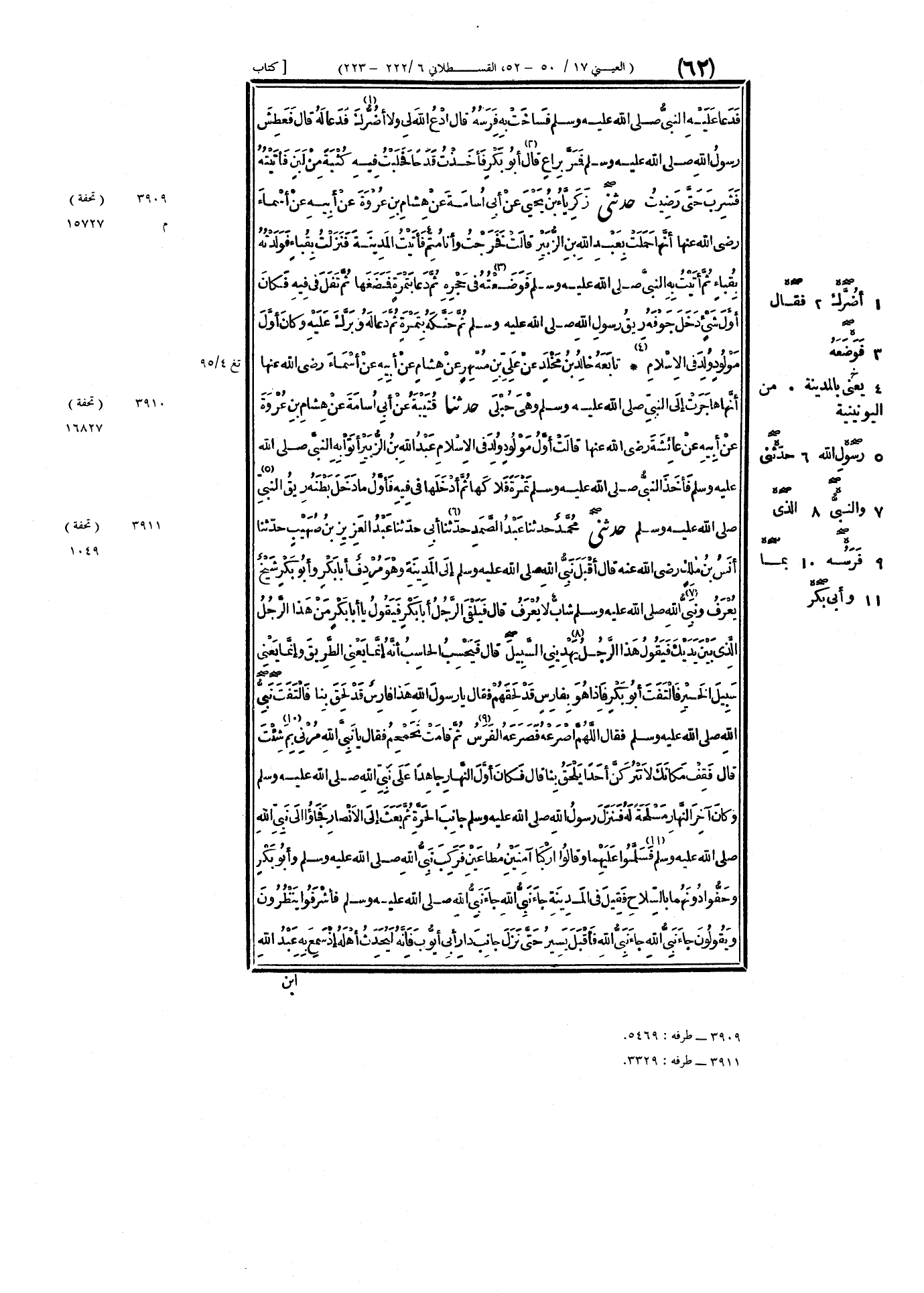 ٣٩٠٩ - حَدَّثَنِي زَكَرِيَّاءُ بْنُ يَحْيَى، عَنْ أَبِي أُسَامَةَ، عَنْ هِشَامِ بْنِ عُرْوَةَ، عَنْ أَبِيهِ، عَنْ أَسْمَاءَ رَضِيَ اللَّهُ عَنْهَا: أَنَّهَا حَمَلَتْ بِعَبْدِ اللَّهِ بْنِ الزُّبَيْرِ، قَالَتْ: فَخَرَجْتُ وَأَنَا مُتِمٌّ فَأَتَيْتُ المَدِينَةَ فَنَزَلْتُ بِقُبَاءٍ فَوَلَدْتُهُ بِقُبَاءٍ، ثُمَّ أَتَيْتُ بِهِ النَّبِيَّ صَلَّى اللهُ عَلَيْهِ وَسَلَّمَ فَوَضَعْتُهُ فِي حَجْرِهِ، ثُمَّ «دَعَا بِتَمْرَةٍ فَمَضَغَهَا، ثُمَّ تَفَلَ فِي فِيهِ، فَكَانَ أَوَّلَ شَيْءٍ دَخَلَ جَوْفَهُ رِيقُ رَسُولِ اللَّهِ صَلَّى اللهُ عَلَيْهِ وَسَلَّمَ، ثُمَّ حَنَّكَهُ بِتَمْرَةٍ ثُمَّ دَعَا لَهُ، وَبَرَّكَ عَلَيْهِ وَكَانَ أَوَّلَ مَوْلُودٍ وُلِدَ فِي الإِسْلَامِ» تَابَعَهُ خَالِدُ بْنُ مَخْلَدٍ، عَنْ عَلِيِّ بْنِ مُسْهِرٍ، عَنْ هِشَامٍ، عَنْ أَبِيهِ، عَنْ أَسْمَاءَ رَضِيَ اللَّهُ عَنْهَا، أَنَّهَا هَاجَرَتْ إِلَى النَّبِيِّ صَلَّى اللهُ عَلَيْهِ وَسَلَّمَ وَهِيَ حُبْلَى