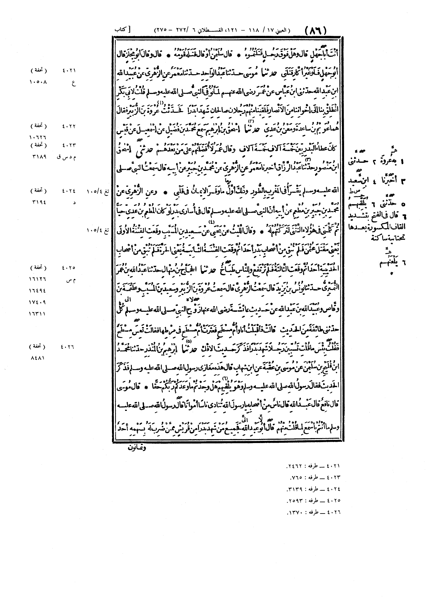 ٤٠٢٦ - حَدَّثَنَا إِبْرَاهِيمُ بْنُ المُنْذِرِ، حَدَّثَنَا مُحَمَّدُ بْنُ فُلَيْحِ بْنِ سُلَيْمَانَ، عَنْ مُوسَى بْنِ عُقْبَةَ، عَنِ ابْنِ شِهَابٍ، قَالَ: هَذِهِ مَغَازِي رَسُولِ اللَّهِ صَلَّى اللهُ عَلَيْهِ وَسَلَّمَ فَذَكَرَ الحَدِيثَ، فَقَالَ رَسُولُ اللَّهِ صَلَّى اللهُ عَلَيْهِ وَسَلَّمَ وَهُوَ يُلْقِيهِمْ «هَلْ وَجَدْتُمْ مَا وَعَدَكُمْ رَبُّكُمْ حَقًّا؟» قَالَ مُوسَى: قَالَ نَافِعٌ: قَالَ عَبْدُ اللَّهِ: قَالَ نَاسٌ مِنْ أَصْحَابِهِ: يَا رَسُولَ اللَّهِ، تُنَادِي نَاسًا أَمْوَاتًا؟ قَالَ رَسُولُ اللَّهِ صَلَّى اللهُ عَلَيْهِ وَسَلَّمَ: «مَا أَنْتُمْ بِأَسْمَعَ لِمَا قُلْتُ مِنْهُمْ»