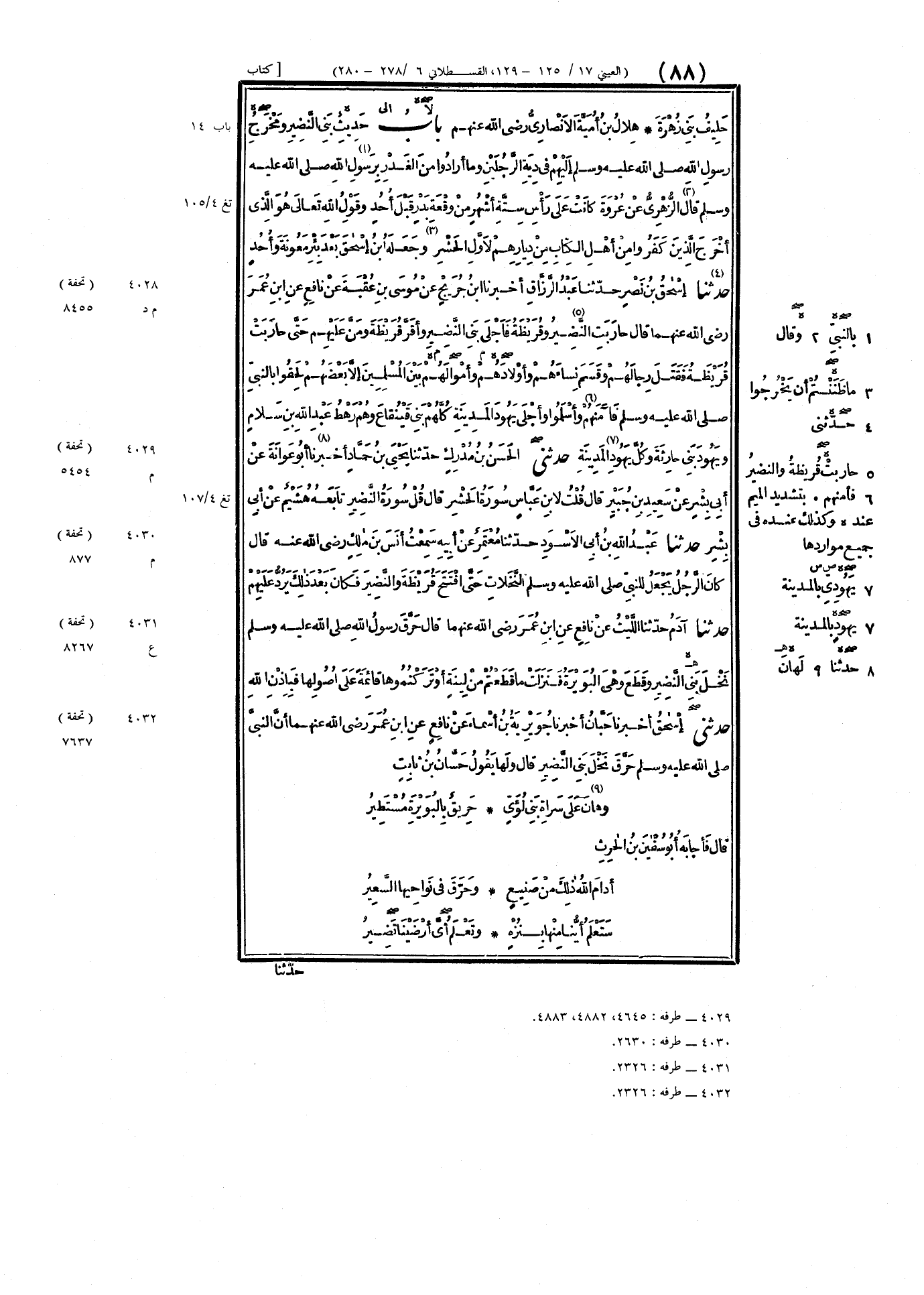 ٤٠٢٨ - حَدَّثَنَا إِسْحَاقُ بْنُ نَصْرٍ، حَدَّثَنَا عَبْدُ الرَّزَّاقِ، أَخْبَرَنَا ابْنُ جُرَيْجٍ، عَنْ مُوسَى بْنِ عُقْبَةَ، عَنْ نَافِعٍ، عَنِ ابْنِ عُمَرَ رَضِيَ اللَّهُ عَنْهُمَا، قَالَ: " حَارَبَتِ النَّضِيرُ، وَقُرَيْظَةُ، فَأَجْلَى بَنِي النَّضِيرِ، وَأَقَرَّ قُرَيْظَةَ وَمَنَّ عَلَيْهِمْ، حَتَّى حَارَبَتْ قُرَيْظَةُ، فَقَتَلَ رِجَالَهُمْ، وَقَسَمَ نِسَاءَهُمْ وَأَوْلَادَهُمْ وَأَمْوَالَهُمْ بَيْنَ المُسْلِمِينَ، إِلَّا بَعْضَهُمْ لَحِقُوا بِالنَّبِيِّ صَلَّى اللهُ عَلَيْهِ وَسَلَّمَ فَآمَنَهُمْ وَأَسْلَمُوا، وَأَجْلَى يَهُودَ المَدِينَةِ كُلَّهُمْ: بَنِي قَيْنُقَاعٍ، وَهُمْ رَهْطُ عَبْدِ اللَّهِ بْنِ سَلَامٍ، وَيَهُودَ بَنِي حَارِثَةَ، وَكُلَّ يَهُودِ المَدِينَةِ "