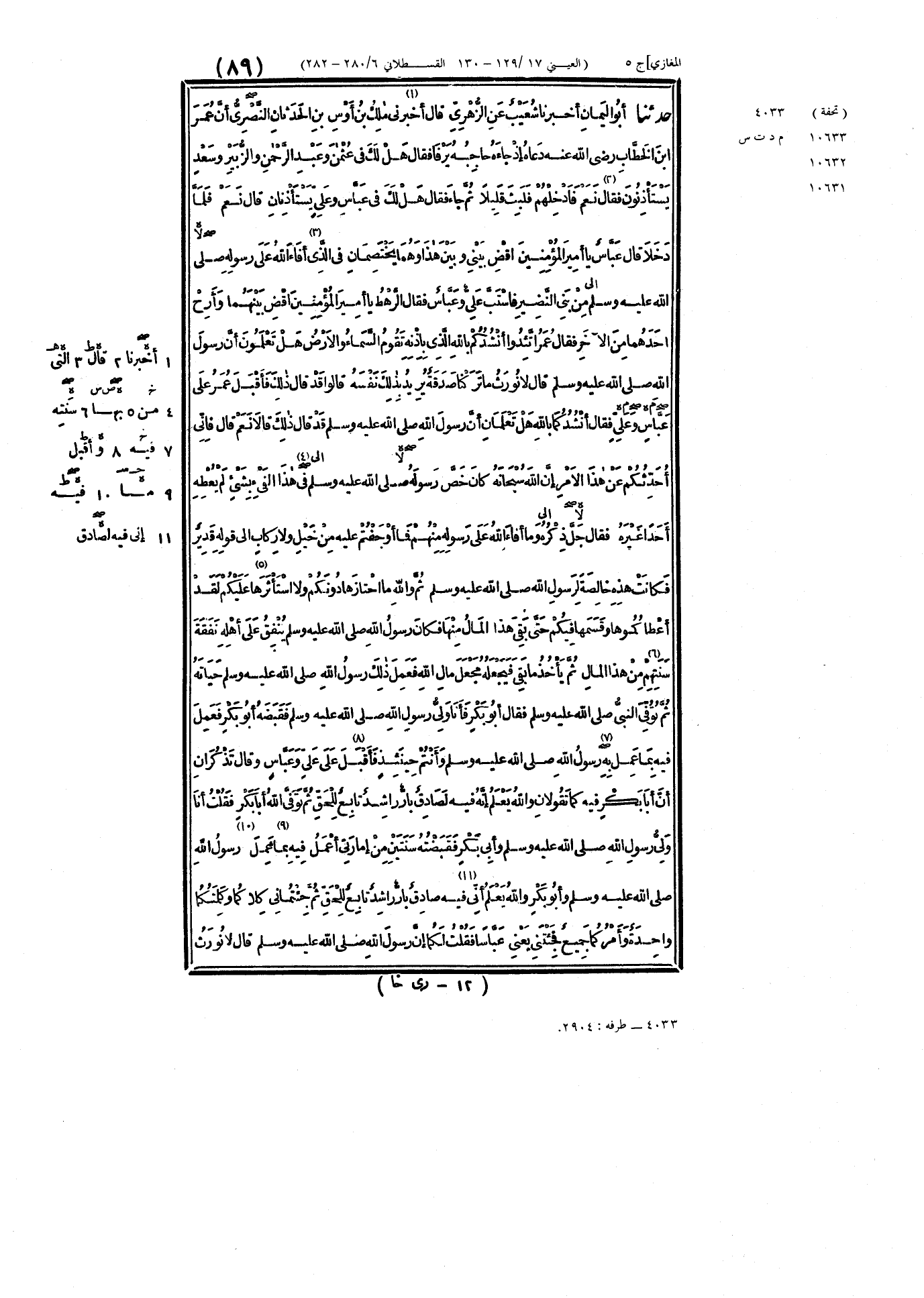 (فاستب. .) ذكر كل منهما مساوئ الآخر. (أتئدوا) تأنوا. (تذكران أن أبا بكر فيه كما تقولان) هل تذكران أن أبا بكر رضي الله عنه قضى فيما ترك رسول الله صلى الله عليه وسلم كما تطلبان أي من قسمته بين ورثته كالميراث. أم قضى فيه كما أقول؟. . (يسألنه ثمنهن مما أقاء الله) يطلبن منه أن يعطيهن مما ترك رسول الله صلى الله عليه وسلم كميراث وهو الثمن مما ترك. (هذه الصدقة) أي ما تركه رسول الله صلى الله عليه وسلم. (فغلبه عليها) بالتصرف فيها وتحصيل غلاتها لا بتخصيص الحاصل بنفسه. (يتداولانها) يتناوبان في التصرف بها]
