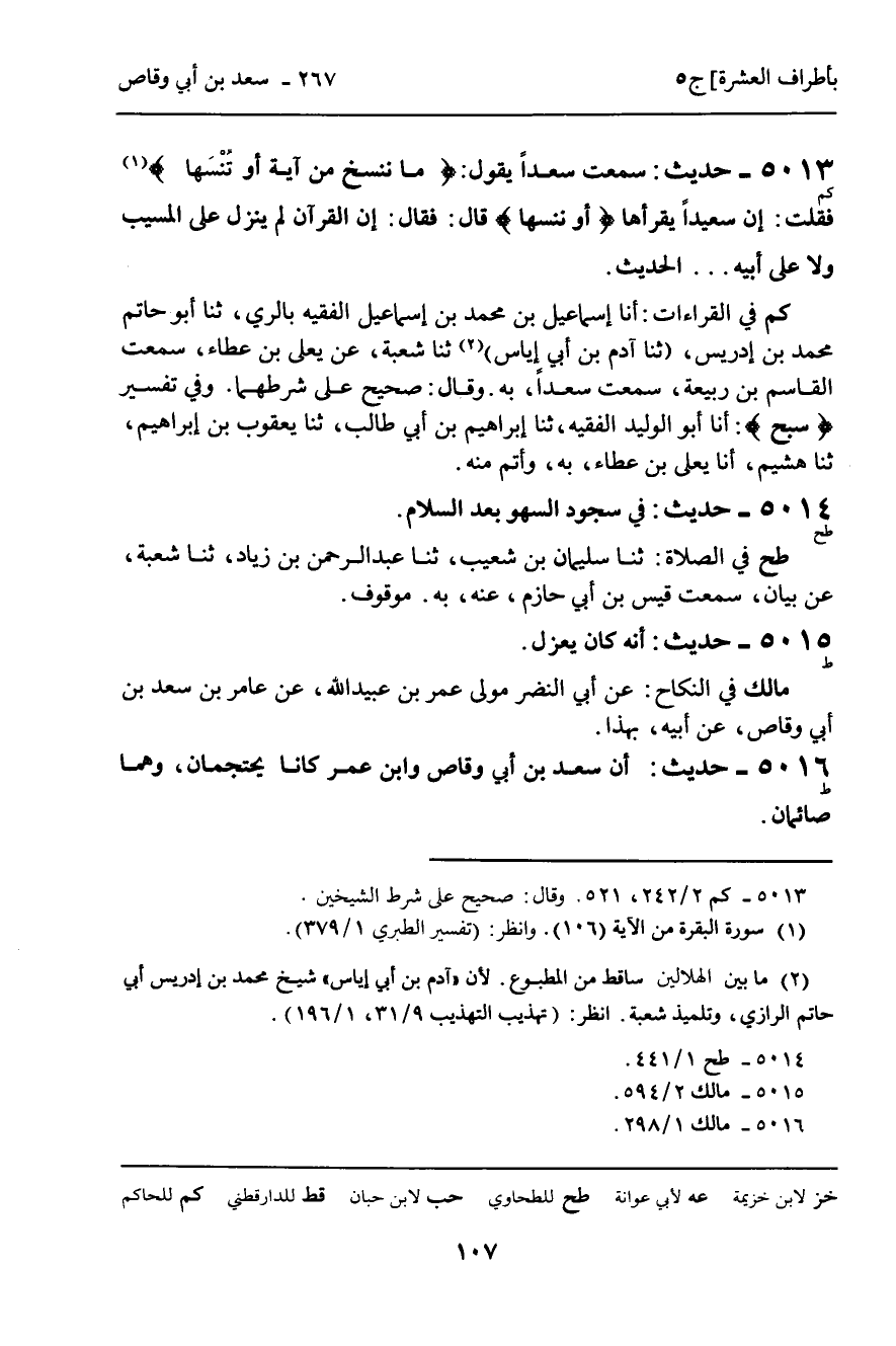 كم فِي الْقِرَاءَاتِ: أنا إِسْمَاعِيلُ بْنُ مُحَمَّدِ بْنِ إِسْمَاعِيلَ الْفَقِيهُ بِالرَّيِّ , ثنا أَبُو حَاتِمٍ مُحَمَّدُ بْنُ إِدْرِيسَ , ثنا آدَمُ بْنُ أَبِي إِيَاسٍ , ثنا شُعْبَةُ , عَنْ يَعْلَى بْنِ عَطَاءٍ , سَمِعْتُ الْقَاسِمَ بْنَ رَبِيعَةَ , سَمِعْتُ سَعْدًا , بِهِ. وَقَالَ: صَحِيحٌ عَلَى شَرْطِهِمَا. وَفِي تَفْسِيرِ سَبِّحْ: أنا أَبُو الْوَلِيدِ الْفَقِيهُ , ثنا إِبْرَاهِيمُ بْنُ أَبِي طَالِبٍ , ثنا يَعْقُوبُ بْنُ إِبْرَاهِيمَ , ثنا هُشَيْمٌ , أنا يَعْلَى بْنُ عَطَاءٍ , بِهِ , وَأَتَمَّ مِنْهُ.