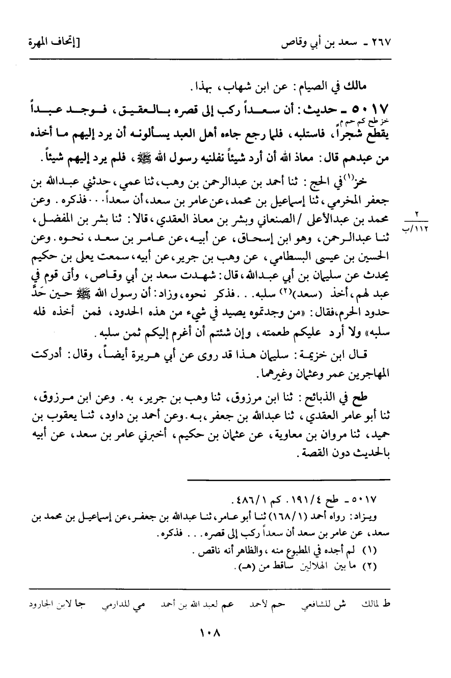 5017 - حَدِيثٌ (خز طح كم حم م) : أَنَّ سَعْدًا رَكِبَ إِلَى قَصْرِهِ بِالْعَقِيقِ , فَوَجَدَ عَبْدًا يَقْطَعُ شَجَرًا , فَاسْتَلَبَهُ , فَلَمَّا رَجَعَ جَاءَهُ أَهْلُ الْعَبْدِ يَسْأَلُونَهُ أَنْ يَرُدَّ إِلَيْهِمْ مَا أَخَذَهُ مِنْ عَبْدِهِمْ، قَالَ: مَعَاذَ اللَّهِ، أَنْ أَرُدَّ شَيْئًا نَفَّلَنِيهِ رَسُولُ اللَّهِ، صَلَّى اللَّهُ عَلَيْهِ وَسَلَّمَ , فَلَمْ يَرُدَّ إِلَيْهِمْ شَيْئًا.