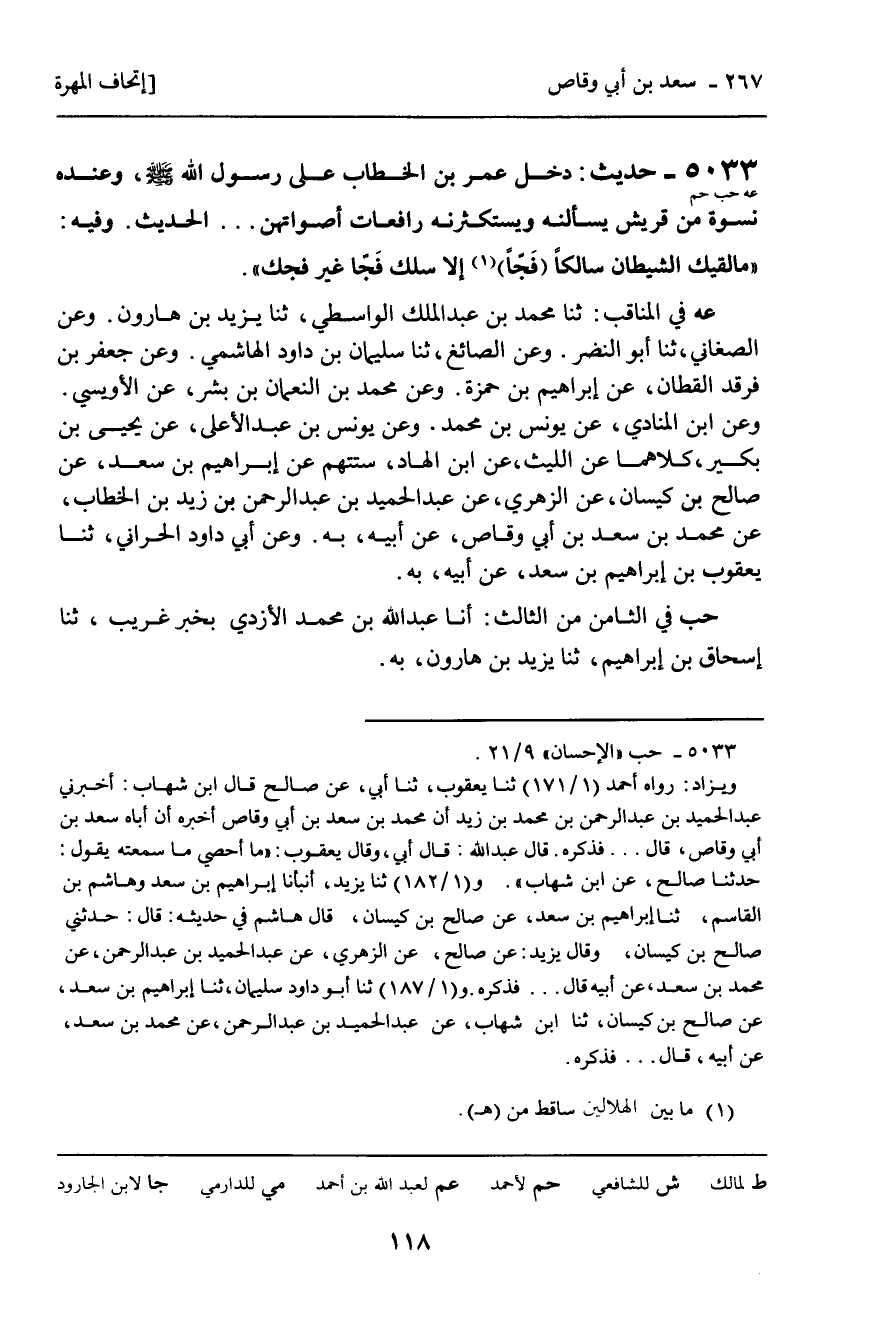 5033 - حَدِيثٌ (عه حب حم) : دَخَلَ عُمَرُ بْنُ الْخَطَّابِ عَلَى رَسُولِ اللَّهِ، صَلَّى اللَّهُ عَلَيْهِ وَسَلَّمَ , وَعِنْدَهُ نِسْوَةٌ مِنْ قُرَيْشٍ يَسْأَلْنَهُ وَيَسْتَكْثِرْنَهُ رَافِعَاتٍ أَصْوَاتَهُنَّ ... الْحَدِيثَ. وَفِيهِ: " مَا لَقِيَكَ الشَّيْطَانُ سَالِكًا فَجًّا إِلا سَلَكَ فَجًّا غَيْرَ فَجِّكَ ".